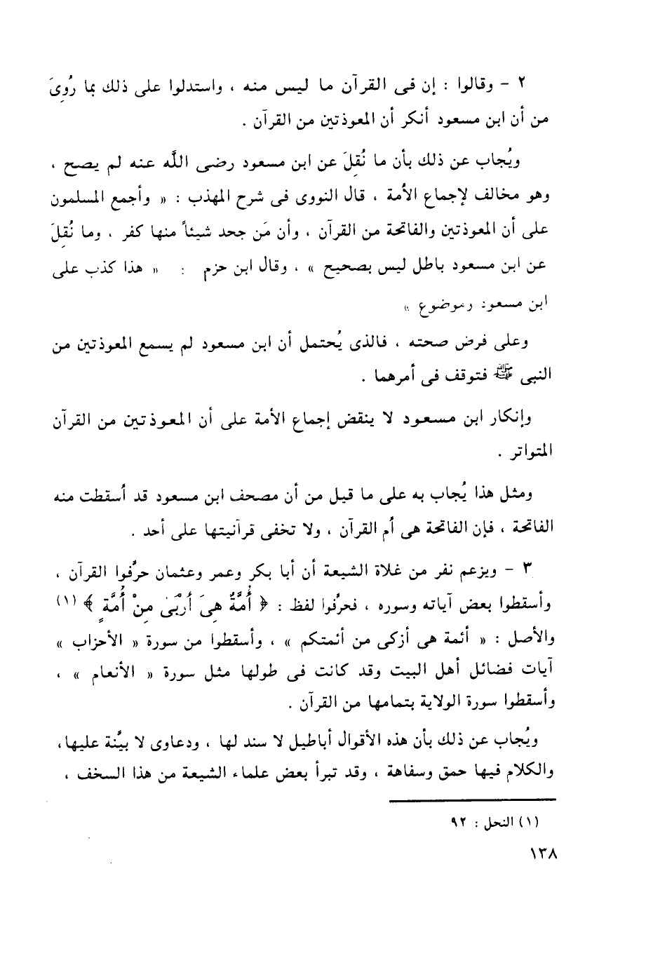 2- وقالوا: إن في القرآن ما ليس منه، واستدلوا على ذلك بما رُوِيَ من أن ابن مسعود أنكر أن المعوذتين من القرآن.