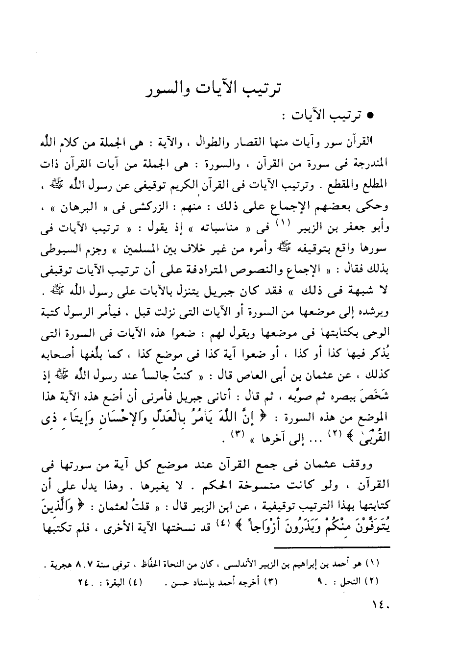 القرآن سور وآيات منها القصار والطوال، والآية: هي الجملة من كلام الله المندرجة في سورة من القرآن، والسورة: هي الجملة من آيات القرآن ذات المطلع والمقطع. وترتيب الآيات في القرآن الكريم توقيفي عن رسول الله -صلى الله عليه وسلم- وحكى بعضهم الإجماع على ذلك: منهم: الزركشي في "البرهان"، وأبو جعفر بن الزبير1 في "مناسباته" إذ يقول: "ترتيب الآيات في سورها واقع بتوقيفه -صلى الله عليه وسلم- وأمره من غير خلاف بين المسلمين" وجزم السيوطي بذلك فقال: "الإجماع والنصوص المترادفة على أن ترتيب الآيات توقيفي لا شبهة في ذلك" فقد كان جبريل يتنزل بالآيات على رسول الله -صلى الله عليه وسلم- ويرشده إلى موضعها من السورة أو الآيات التي نزلت قبل، فيأمر الرسول كتبة الوحي بكتابتها في موضعها ويقول لهم: ضعوا هذه الآيات في السورة التي يُذكر فيها كذا أو كذا، أو ضعوا آية كذا في موضع كذا، كما بلَّغها أصحابه كذلك، عن عثمان بن أبي العاص قال: "كنت جالسًا عند رسول الله -صلى الله عليه وسلم- إذ شَخَصَ ببصره ثم صوَّبه، ثم قال: أتاني جبريل فأمرني أن أضع هذه الآية هذا الموضع من هذه السورة: {إِنَّ اللَّهَ يَأْمُرُ بِالْعَدْلِ وَالْإِحْسَانِ وَإِيتَاءِ ذِي الْقُرْبَى} 2 ... إلى آخرها"3.