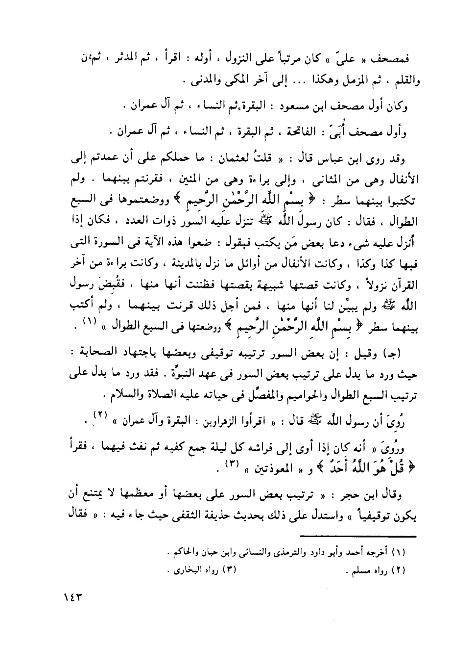 وقال ابن حجر: "ترتيب بعض السور على بعضها أو معظمها لا يمتنع أن يكون توقيفيًّا" واستدل على ذلك بحديث حذيفة الثقفي حيث جاء فيه: "فقال