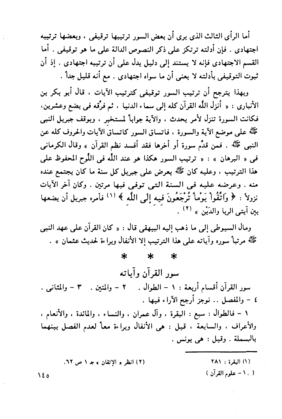 سور القرآن أقسام أربعة: 1- الطوال. 2- والمئين. 3- والمثاني. 4- والمفصَّل.. نوجز أرجح الآراء فيها.