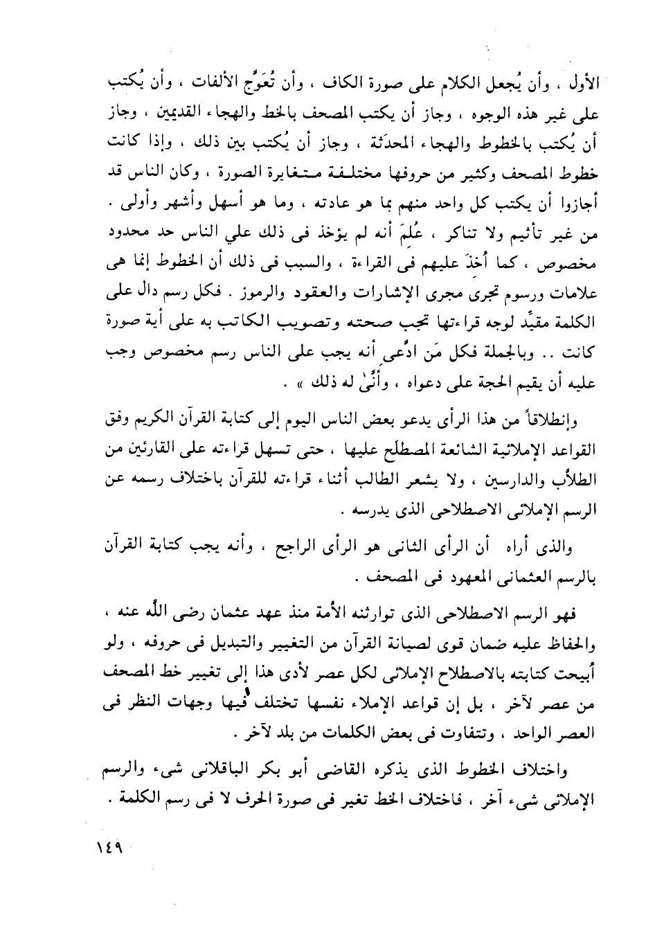 الأول، وأن يُجعل الكلام على صورة الكاف، وأن تُعوَّج الألفات، وأن يُكتب على غير هذه الوجوه، وجاز أن يكتب المصحف بالخط والهجاء القديمين، وجاز أن يُكتب بالخطوط والهجاء المحدَثة، وجاز أن يُكتب بين ذلك، وإذا كانت خطوط المصحف وكثير من حروفها مختلفة متغايرة الصورة، وكان الناس قد أجازوا أن يكتب كل واحد منهم بما هو عادته، وما هو أسهل وأشهر وأولى. من غير تأثيم ولا تناكر، عُلِمَ أنه لم يؤخذ في ذلك على الناس حد محدود مخصوص، كما أُخِذَ عليهم في القراءة، والسبب في ذلك أن الخطوط إنما هي علامات ورسوم تجري مجرى الإشارات والعقود والرموز. فكل رسم دال على الكلمة مقيد لوجه قراءتها تجب صحته وتصويب الكاتب به على أية صورة كانت.. وبالجملة فكل من ادعى أنه يجب على الناس رسم مخصوص وجب عليه أن يقيم الحجة على دعواه، وأنَّى له ذلك".