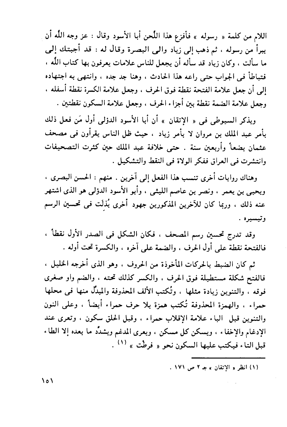 اللام من كلمة "رسوله" فأفزع هذا اللحن أبا الأسود وقال: عز وجه الله أن يبرأ من رسوله، ثم ذهب إلى زياد والي البصرة وقال له: قد أجبتك إلى ما سألت، وكان زياد قد سأله أن يجعل للناس علامات يعرفون بها كتاب الله، فتباطأ في الجواب حتى راعه هذا الحادث، وهنا جد جده، وانتهى به اجتهاده إلى أن جعل علامة الفتحة نقطة فوق الحرف، وجعل علامة الكسرة نقطة أسفله، وجعل علامة الضمة نقطة بين أجزاء الحرف، وجعل علامة السكون نقطتين.