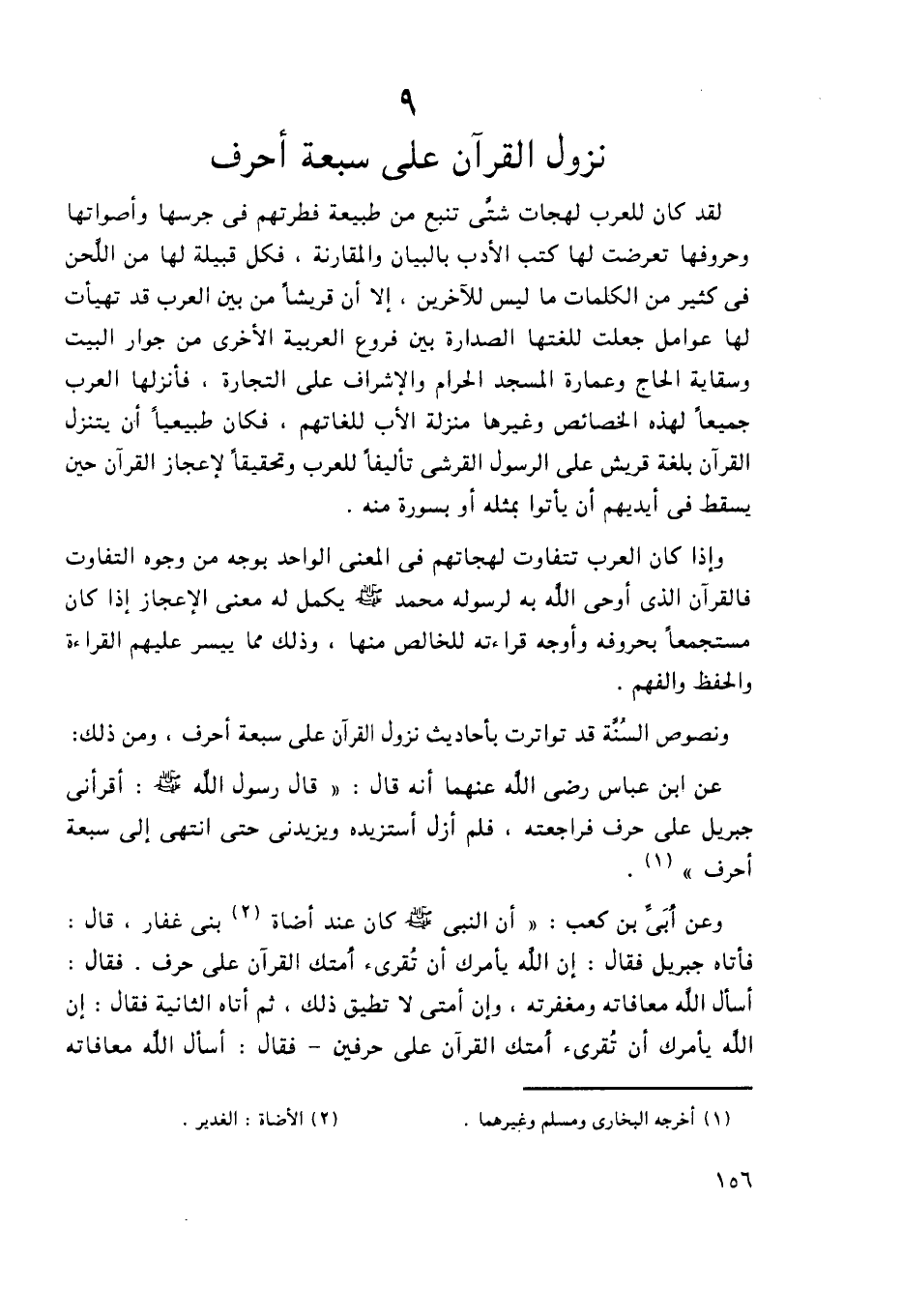 وعن أُبَيِّ بن كعب: "أن النبي -صلى الله عليه وسلم- كان عند أضاة2 بني غفار، قال: فأتاه جبريل فقال: إن الله يأمرك أن تُقرئ أمتك القرآن على حرف. فقال: "أسال الله معافاته ومغفرته، وإن أمتي لا تطيق ذلك"، ثم أتاه الثانية فقال: إن الله يأمرك أن تُقرئ أمتك القرآن على حرفين - فقال: "أسأل الله معافاته