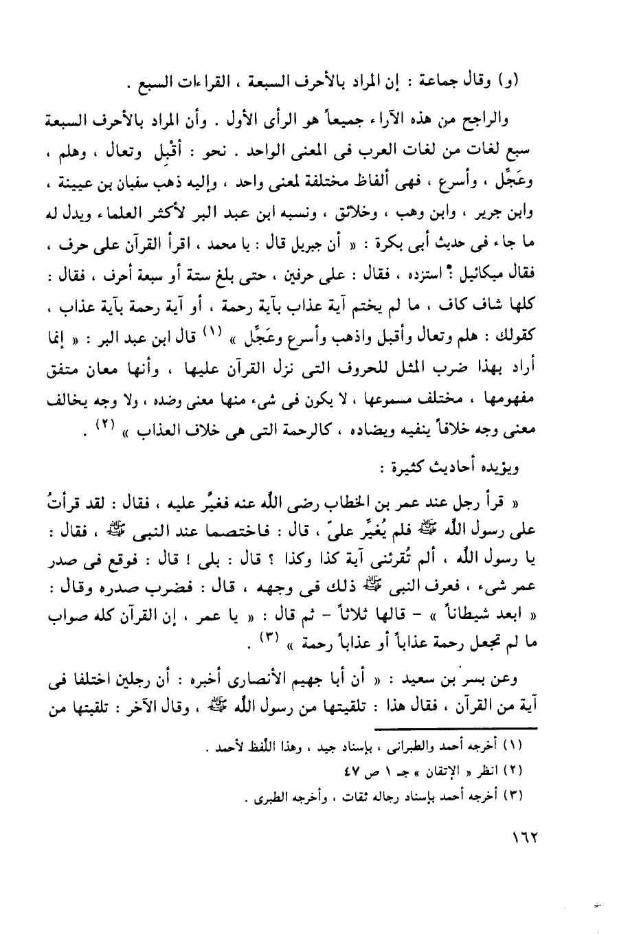 والراجح من هذه الآراء جميعًا هو الرأي الأول، وأن المراد بالأحرف السبعة سبع لغات من لغات العرب في المعنى الواحد. نحو: أَقْبِل وتعال، وهلم، وعَجِّل، وأسرع، فهي ألفاظ مختلفة لمعنى واحد، وإليه ذهب سفيان بن عيينة، وابن جرير، وابن وهب، وخلائق، ونسبه ابن عبد البر لأكثر العلماء ويدل له ما جاء في حديث أبي بكرة: "أن جبريل قال: يا محمد، اقرأ القرآن على حرف، فقال ميكائيل: استزده، فقال: على حرفين, حتى بلغ ستة أو سبعة أحرف، فقال: كلها شاف كاف، ما لم يختم آية عذاب بآية رحمة، أو آية رحمة بآية عذاب، كقولك: هلم وتعالى وأَقْبِل واذهب وأسرع وعَجِّل"1, قال ابن عبد البر: "إنما أراد بهذا ضرب المثل للحروف التي نزل القرآن عليها، وأنها معان متفق مفهومها، مختلف مسوعها، لا يكون في شيء منها معنى وضده، ولا وجه يخالف معنى وجه خلافًا ينفيه ويضاده، كالرحمة التي هي خلاف العذاب"2.