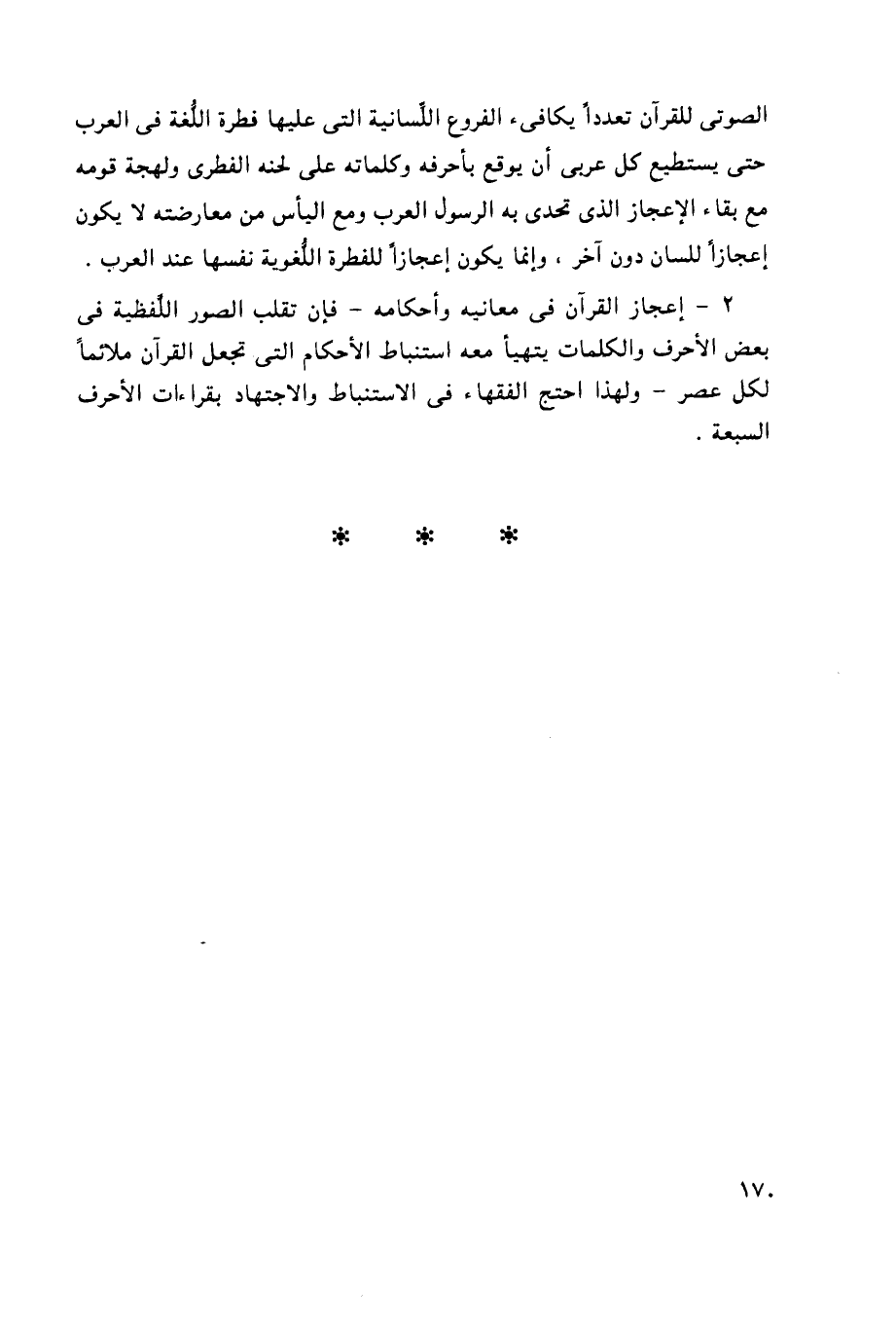 الصوتي للقرآن تَعدُّدًا يكافئ الفروع اللسانية التي عليها فطرة اللغة في العرب حتى يستطيع كل عربي أن يوقع بأحرفه وكلماته على لحنه الفطري ولهجة قومه مع بقاء الإعجاز الذي تحدى به الرسول العرب ومع اليأس من معارضته لا يكون إعجازًا للسان دون آخر، وإنما يكون إعجازًا للفطرة اللغوية نفسها عند العرب.