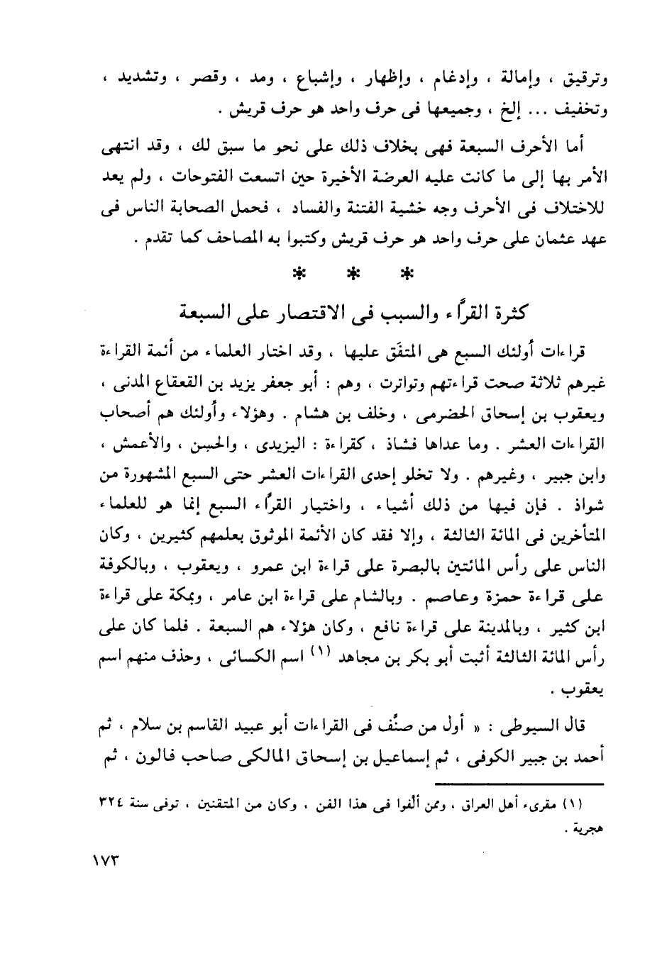 قراءات أولئك السبع هي المتفق عليها، وقد اختار العلماء من أئمة القراءة غيرهم ثلاثة صحت قراءتهم وتواترت، وهم: أبو جعفر يزيد بن القعقاع المدني، ويعقوب بن إسحاق الحضرمي، وخلف بن هشام، وهؤلاء وأولئك هم أصحاب القراءات العشر. وما عداها فشاذ، كقراءة: اليزيدي، والحسن, والأعمش، وابن جبير، وغيرهم. ولا تخلو إحدى القراءات العشر حتى السبع المشهورة من شواذ. فإن فيها من ذلك أشياء، واختيار القرَّاء السبع إنما هو للعلماء المتأخرين في المائة الثالثة، وإلا فقد كان الأئمة الموثوق بعلمهم كثيرين، وكان الناس على رأس المائتين بالبصرة على قراءة ابن عمرو, ويعقوب، وبالكوفة على قراءة حمزة وعاصم، وبالشام على قراءة ابن عامر، وبمكة على قراءة ابن كثير، وبالمدينة على قراءة نافع، وكان هؤلاء هم السبعة. فلما كان على رأس المائة الثالثة أثبت أبو بكر بن مجاهد1 اسم الكسائي، وحذف منهم اسم يعقوب.