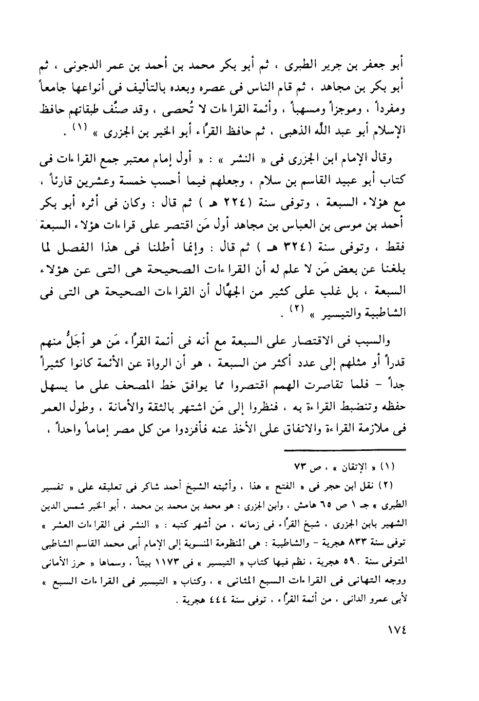2 نقل ابن حجر في "الفتح" هذا، وأثبته الشيخ أحمد شاكر في تعليقه على "تفسير الطبري" جـ1 ص65 هامش، وابن الجزري: هو محمد بن محمد بن محمد، أبو الخير شمس الدين الشهير بابن الجزري، شيخ القرَّاء في زمانه، من أشهر كتبه: "النشر في القراءات العشر" توفي سنة 833 هجرية, والشاطبية: هي المنظومة المنسوبة إلى الإمام أبي محمد القاسم الشاطبي المتوفى سنة 590 هجرية، نظم فيها كتاب "التيسير" في 1173 بيتًا، وسماها "حرز الأماني ووجه التهاني في القراءات السبع المثاني"، وكتاب "التيسير في القراءات السبع" لأبي عمرو الداني، من أئمة القرَّاء، توفي سنة 444 هجرية.