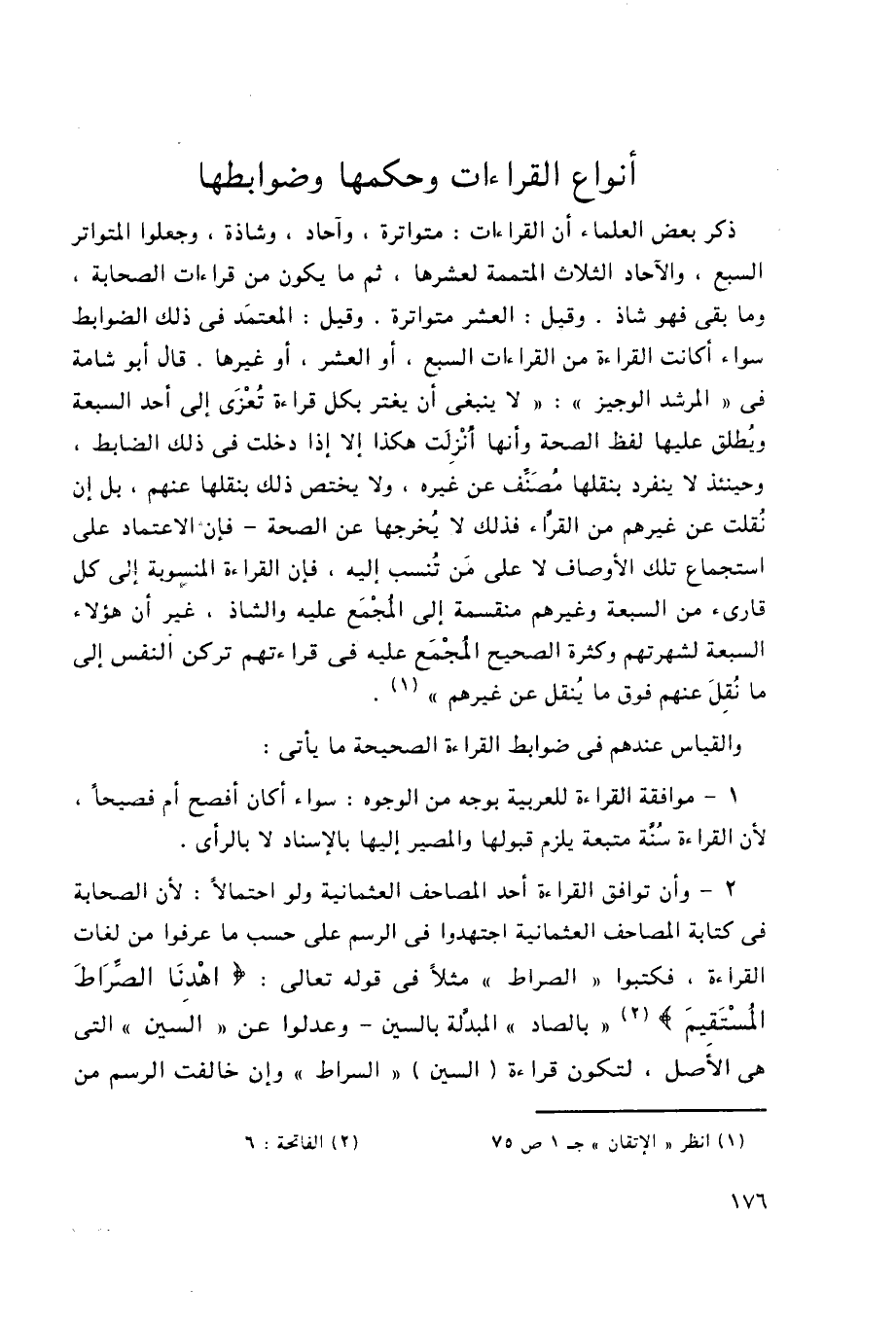 2 وأن توافق القراءة أحد المصاحف العثمانية ولو احتمالًا: لأن الصحابة في كتابة المصاحف العثمانية اجتهدوا في الرسم على حسب ما عرفوا من لغات القراءة، فكتبوا "الصراط" مثلًا في قوله تعالى: {اهْدِنَا الصِّرَاطَ الْمُسْتَقِيمَ} 2, "بالصاد" المبدَّلة بالسين - وعدلوا عن "السين" التي هي الأصل، لتكون قراءة "السين" "السراط" وإن خالفت الرسم من