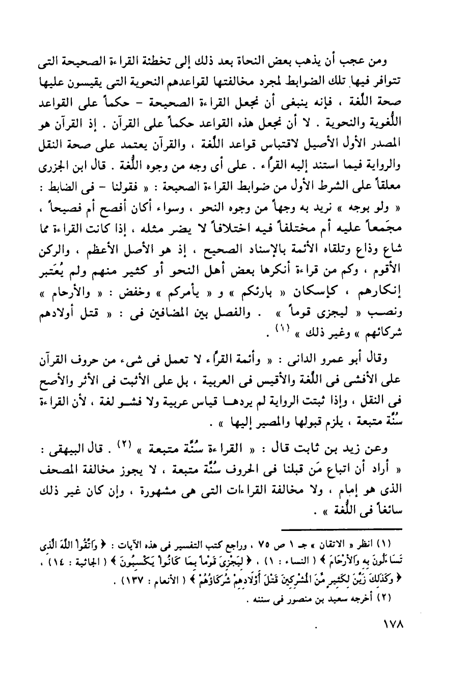 ومن عجب أن يذهب بعض النحاة بعد ذلك إلى تخطئة القراءة الصحيحة التي تتوافر فيها تلك الضوابط لمجرد مخالفتها لقواعدهم النحوية التي يقيسون عليها صحة اللغة، فإنه ينبغي أن نجعل القراءة الصحيحة, حَكَمًا على القواعد اللغوية والنحوية. لا أن نجعل هذه القواعد حَكَمًا على القرآن. إذ القرآن هو المصدر الأول الأصيل لاقتباس قواعد اللغة، والقرآن يعتمد على صحة النقل والرواية فيما استند إليه القُرَّاء. على أي وجه من وجوه اللغة. قال ابن الجزري معلقًا على الشرط الأول من ضوابط القراءة الصحيحة: "فقولنا, في الضابط: "ولو بوجه" نريد به وجهًا من وجوه النحو، وسواء أكان أفصح أم فصيحًا، مُجْمَعًا عليه أم مختلفًا فيه اختلافًا لا يضر مثله، إذا كانت القراءة مما شاع وذاع وتلقاه الأئمة بالإسناد الصحيح، إذ هو الأصل الأعظم، والركن الأقوم، وكم من قراءة أنكرها بعض أهل النحو أو كثير منهم ولم يُعْتَبر إنكارهم، كإسكان "بارئكم" و"يأمركم" وخفض: "والأرحام" ونصب "ليجزي قومًا". والفصل بين المضافين في: "قتل أولادهم شركائهم" وغير ذلك1".