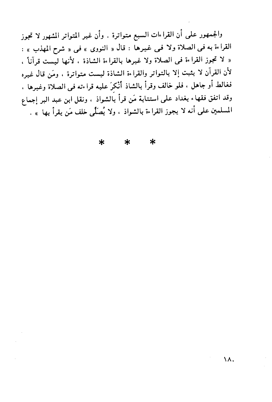 والجمهور على أن القراءات السبع متواترة، وأن غير المتواتر المشهور لا تجوز القراءة به في الصلاة ولا في غيرها: قال "النووي" في "شرح المهذب": "لا تجوز القراءة في الصلاة ولا غيرها بالقراءة الشاذة، لأنها ليست قرآنًا، لأن القرآن لا يثبت إلا بالتواتر والقراءة الشاذة ليست متواترة، ومن قال غيره فغالط أو جاهل، فلو خالف وقرأ بالشاذ أنكر عليه قراءته في الصلاة وغيرها، وقد اتفق فقهاء بغداد على استتابة من قرأ بالشواذ، ونقل ابن عبد البر إجماع المسلمين على أنه لا يجوز القراءة بالشواذ، ولا يُصلَّى خلف مَن يقرأ بها".
