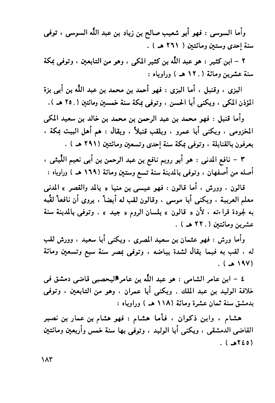 هشام، وابن ذكوان، فأما هشام: فهو هشام بن عمار بن نصير القاضي الدمشقي، ويكنى أبا الوليد، وتوفي بها سنة خمس وأربعين ومائتين "245هـ".