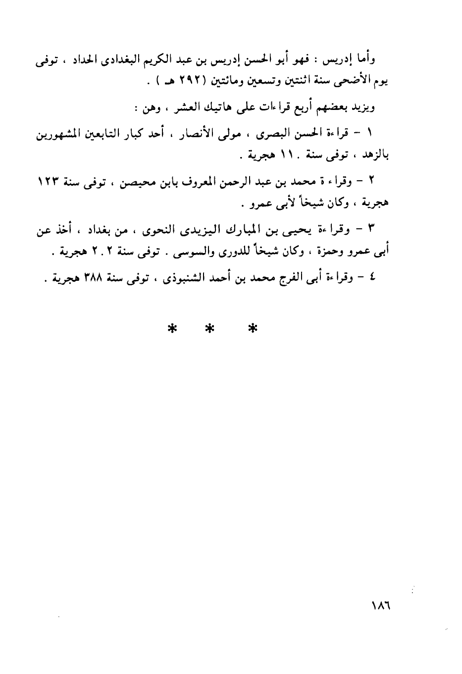 3- وقراءة يحيى بن المبارك اليزيدي النحوي، من بغداد، أخذ عن أبي عمرو وحمزة، وكان شيخًا للدوري والسوسي. توفي سنة 202 هجرية.