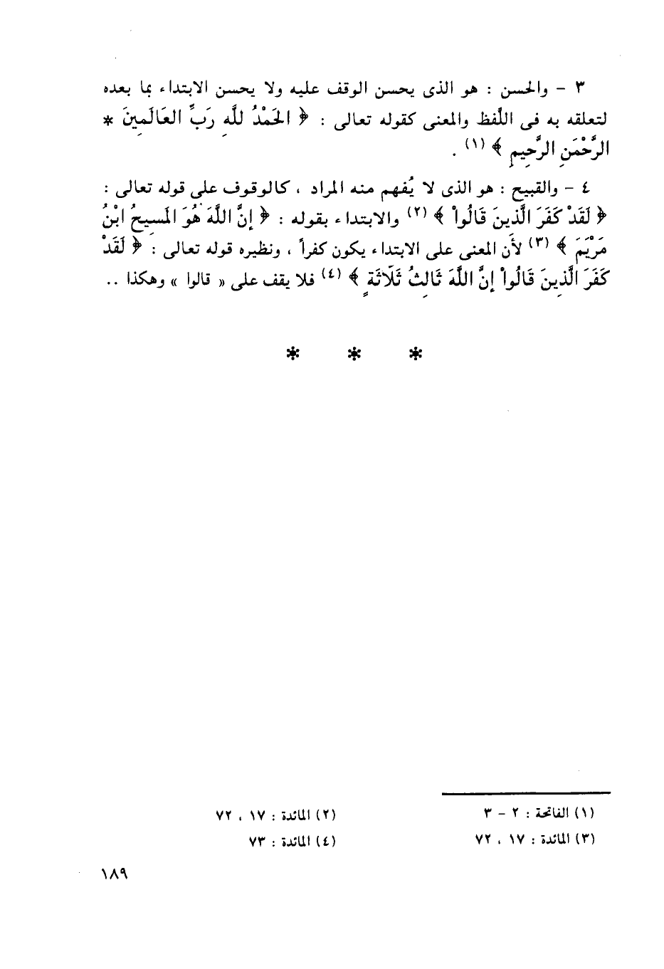 4- والقبيح: هو الذي لا يفهم منه المراد، كالوقوف على قوله تعالى {لَقَدْ كَفَرَ الَّذِينَ قَالُوا} 2, والابتداء بقوله: {إِنَّ اللَّهَ هُوَ الْمَسِيحُ ابْنُ مَرْيَمَ} 3؛ لأن المعنى على الابتداء يكون كفرًا، ونظيره قوله تعالى: {لَقَدْ كَفَرَ الَّذِينَ قَالُوا إِنَّ اللَّهَ ثَالِثُ ثَلاثَةٍ} 4, فلا يقف على "قالوا" وهكذا..