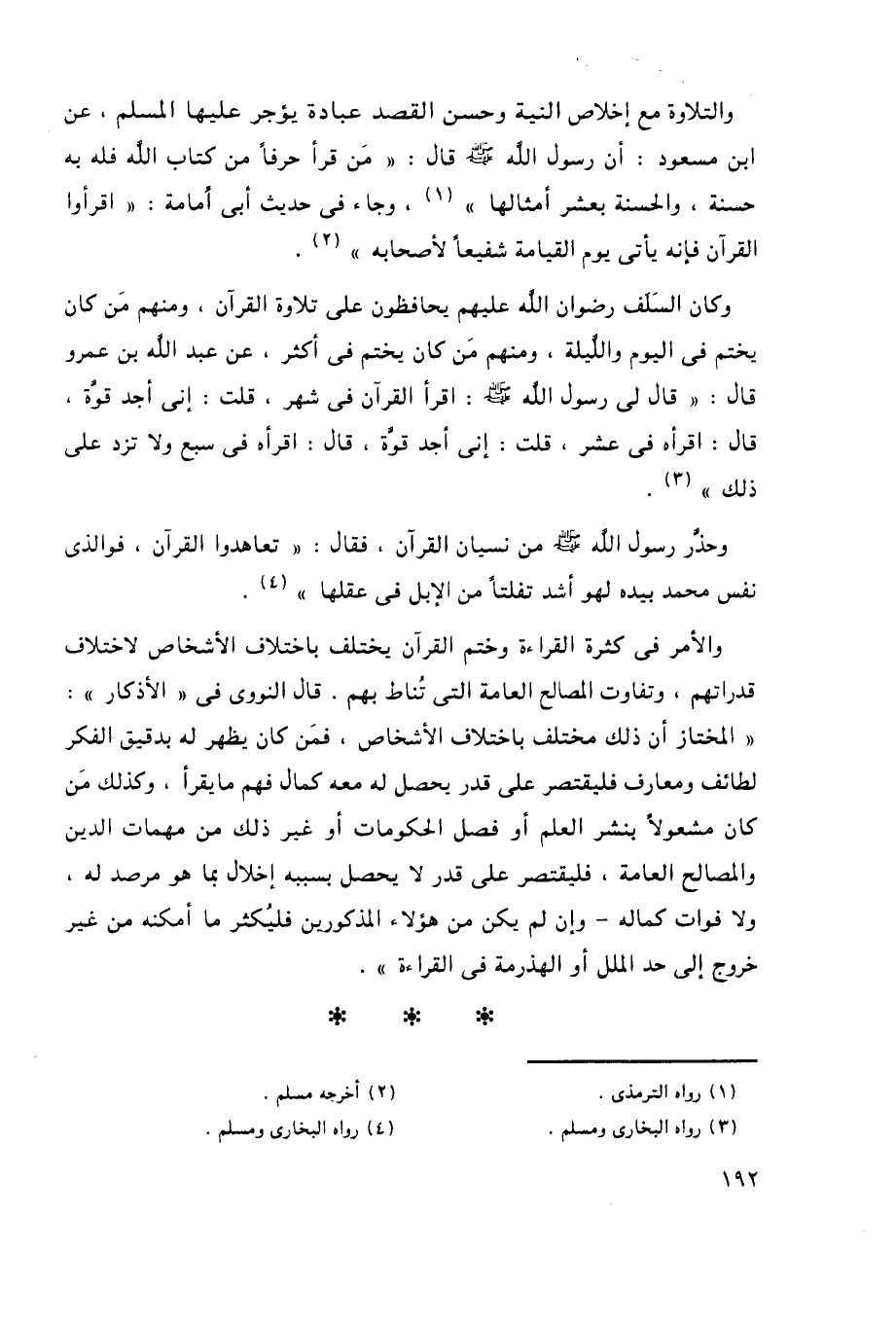 وكان السلف رضوان الله عليهم يحافظون على تلاوة القرآن, ومنهم من كان يختم في اليوم والليلة، ومنهم من كان يختم في أكثر، عن عبد الله بن عمرو قال: قال لي رسول الله, صلى الله عليه وسلم: "اقرأ القرآن في شهر، قلت: إني أجد قوة، قال: اقرأه في عشر، قلت: إني أجد قوة، قال: اقرأه في سبع ولا تزد على ذلك" 3.