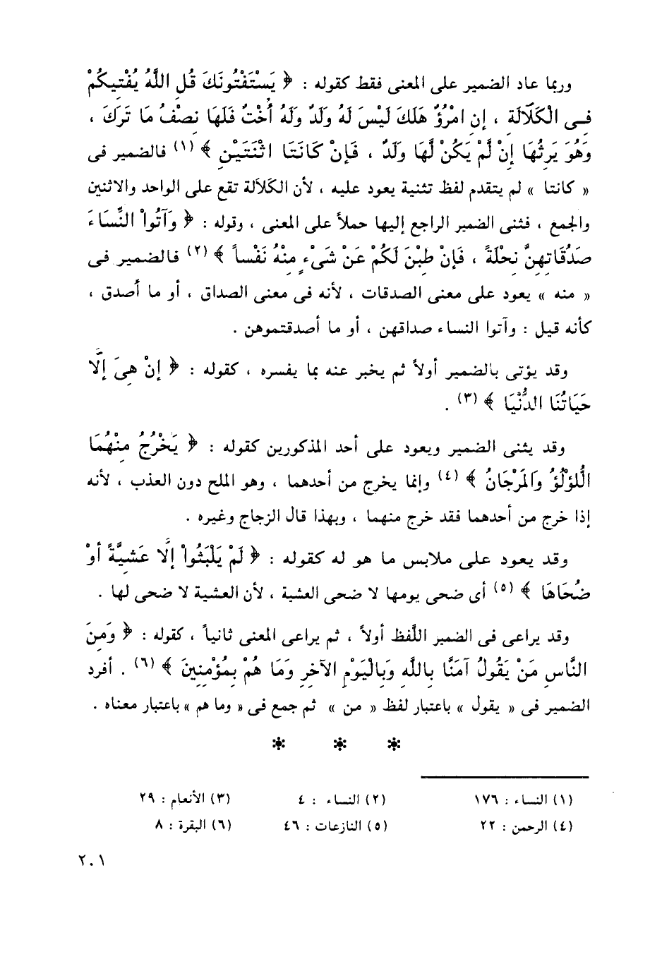 وقد يراعى في الضمير اللفظ أولًا، ثم يراعى المعنى ثانيًا، كقوله: {وَمِنَ النَّاسِ مَنْ يَقُولُ آمَنَّا بِاللَّهِ وَبِالْيَوْمِ الْآخِرِ وَمَا هُمْ بِمُؤْمِنِينَ} 6, أفرد الضمير في "يقول" باعتبار لفظ "من" ثم جمع في "وما هم" باعتبار معناه.