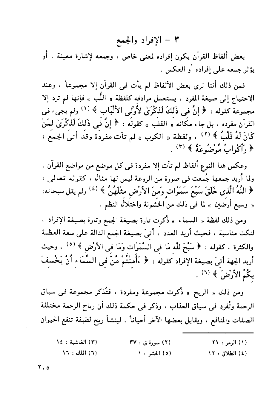 ومن ذلك لفظة "السماء" ذكرت تارة بصيغة الجمع وتارة بصيغة الإفراد، لنكت مناسبة، فحيث أريد العدد، أُتِي بصيغة الجمع الدالة على سعة العظمة والكثرة، كقوله: {سَبَّحَ لِلَّهِ مَا فِي السَّمَاوَاتِ وَمَا فِي الأَرْضِ} 5، وحيث أريد الجهة أُتِي بصيغة الإفراد كقوله: {أَأَمِنْتُمْ مَنْ فِي السَّمَاءِ أَنْ يَخْسِفَ بِكُمُ الْأَرْضَ} 6.