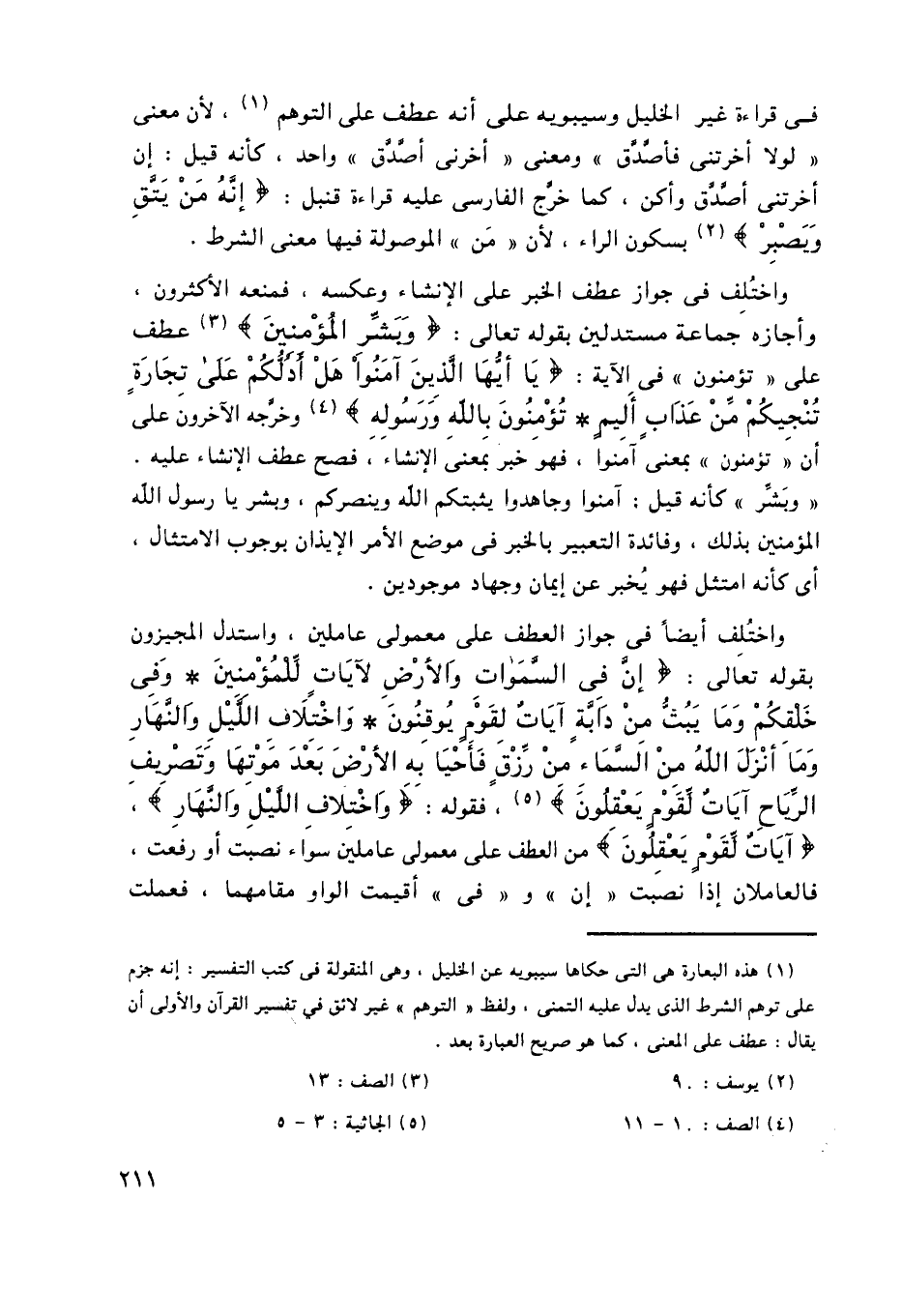 واختُلِف في جواز عطف الخبر على الإنشاء وعكسه، فمنعه الأكثرون، وأجازه جماعة مستدلين بقوله تعالى: {وَبَشِّرِ الْمُؤْمِنِينَ} 3, عطف على "تؤمنون" في الآية: {يَا أَيُّهَا الَّذِينَ آمَنُوا هَلْ أَدُلُّكُمْ عَلَى تِجَارَةٍ تُنْجِيكُمْ مِنْ عَذَابٍ أَلِيمٍ, تُؤْمِنُونَ بِاللَّهِ وَرَسُولِهِ} 4, وخرَّجه الآخرون على أن "تؤمنون" بمعنى آمنوا، فهو خبر بمعنى الإنشاء، فصح عطف الإنشاء عليه، و"بشِّر" كأنه قيل: آمنوا وجاهدوا يثبتكم الله وينصركم، وبشِّر يا رسول الله المؤمنين بذلك، وفائدة التعبير بالخبر في موضع الأمر الإيذان بوجوب الامتثال، أي كأنه امتثل فهو يُخبر عن إيمان وجهاد موجودين.
