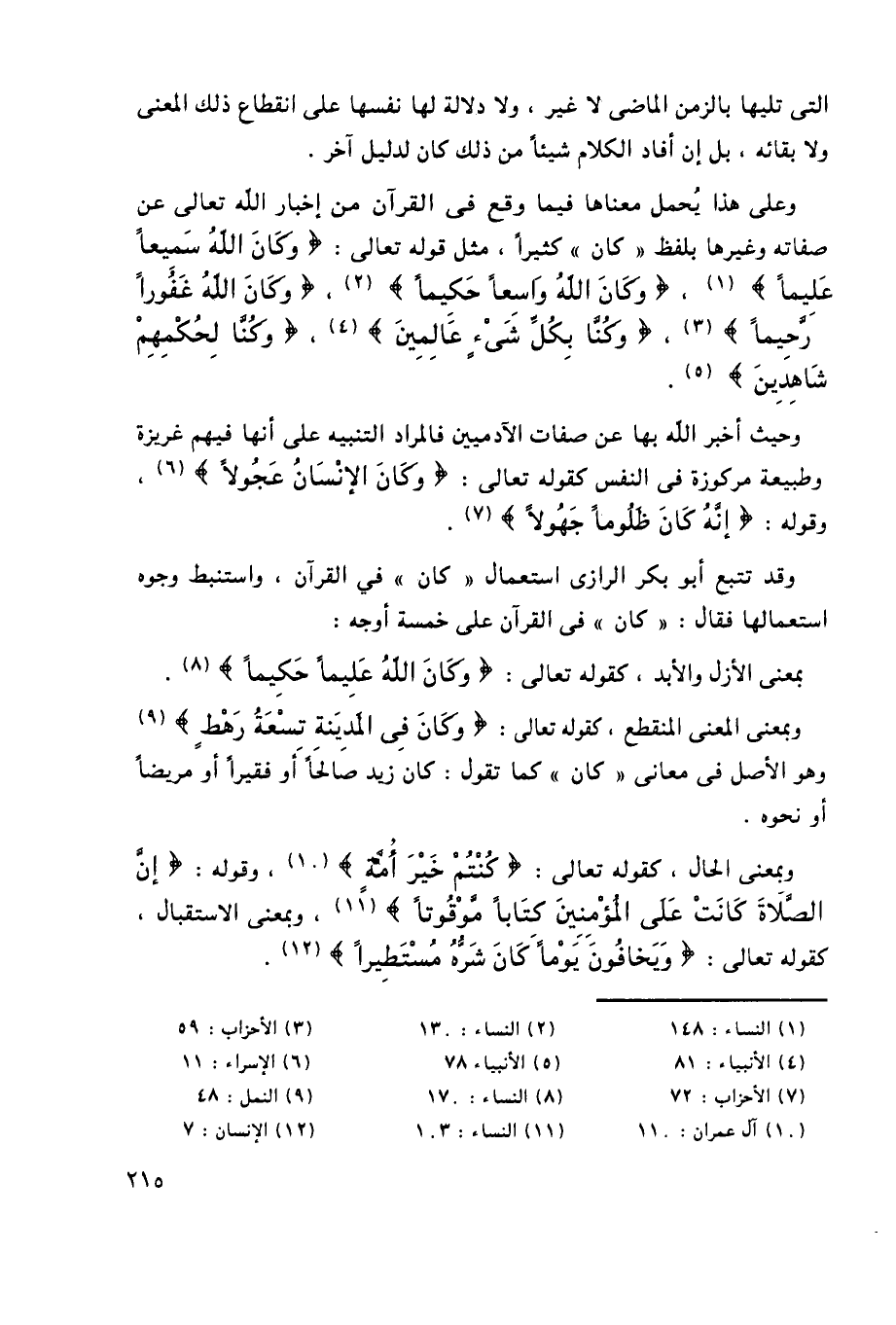 وعلى هذا يُحمل معناها فيما وقع في القرآن من إخبار الله تعالى عن صفاته وغيرها بلفظ "كان" كثيرًا. مثل قوله تعالى: {وَكَانَ اللَّهُ سَمِيعًا عَلِيمًا} 1، {وَكَانَ اللَّهُ وَاسِعًا حَكِيمًا} 2، {وَكَانَ اللَّهُ غَفُورًا رَحِيمًا} 3، {وَكُنَّا بِكُلِّ شَيْءٍ عَالِمِينَ} 4، {وَكُنَّا لِحُكْمِهِمْ شَاهِدِينَ} 5.