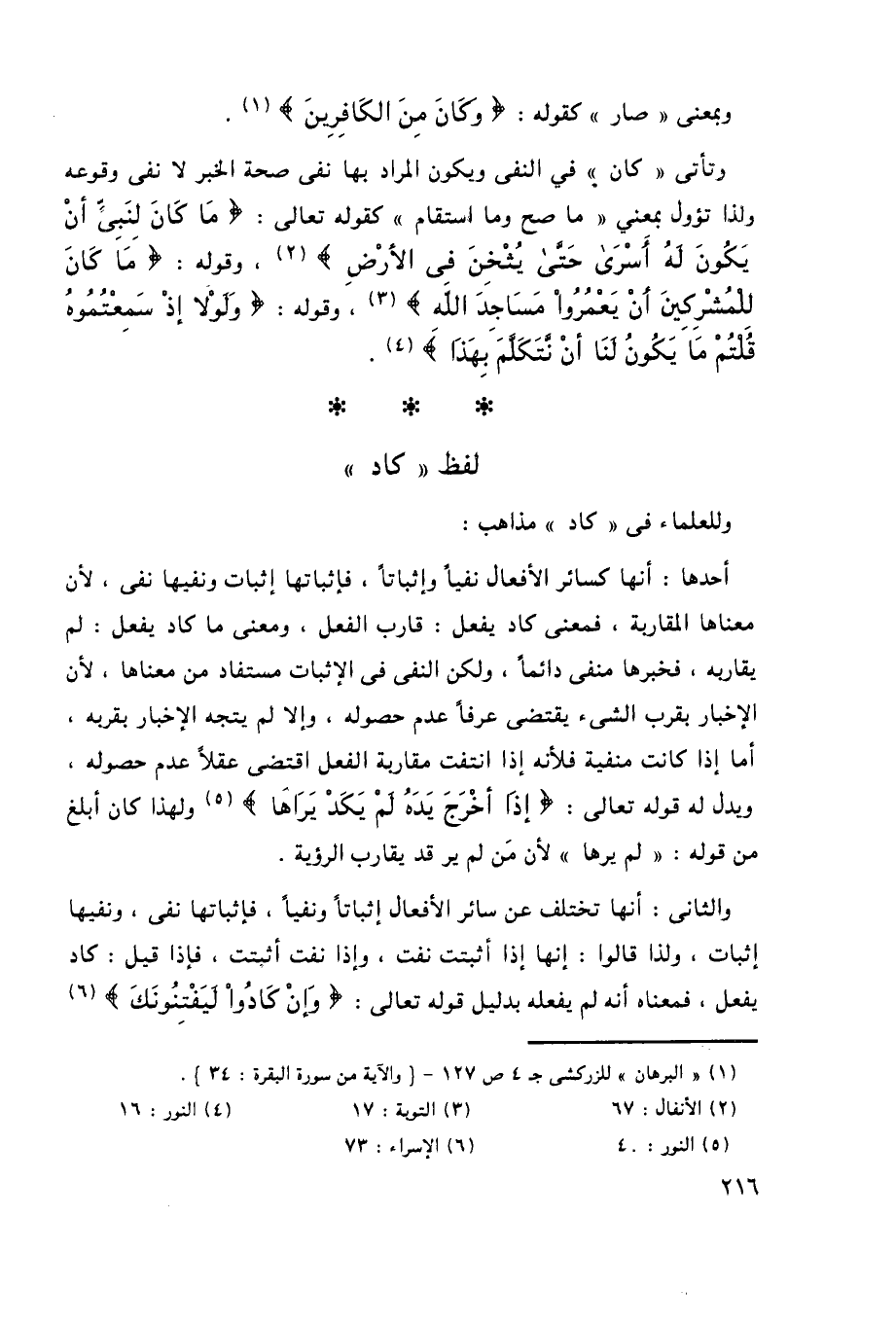 والثاني: أنها تختلف عن سائر الأفعال إثباتًا ونفيًا، فإثباتها نفي، ونفيها إثبات، ولذا قالوا: إنها إذا أثبتت نفت، وإذا نفت أثبتت، فإذا قيل: كاد يفعل، فمعناه أنه لم يفعله بدليل قوله تعالى: {وَإِنْ كَادُوا لَيَفْتِنُونَكَ} 2,