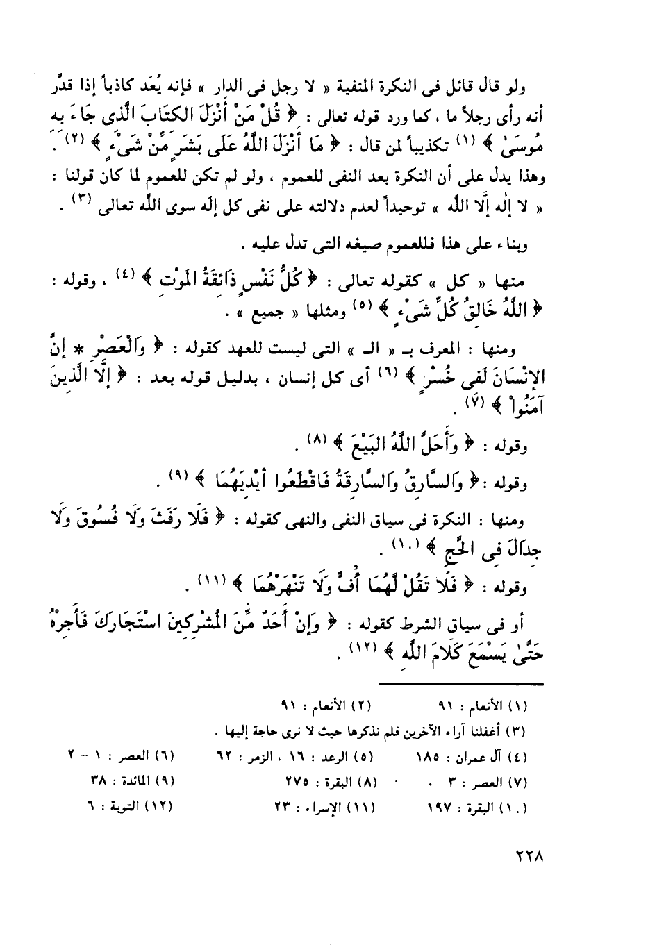 ومنها: المعرف بـ "ال" التي ليست للعهد كقوله: {وَالْعَصْرِ, إِنَّ الإِنسَانَ لَفِي خُسْرٍ} 6, أي كل إنسان، بدليل قوله بعد: {إِلَّا الَّذِينَ آمَنُوا} 7.
