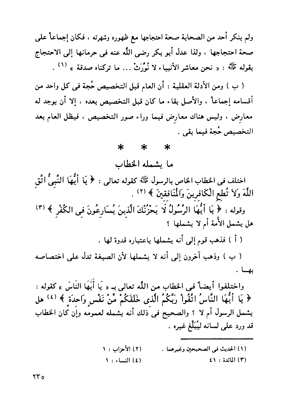 واختلفوا أيضًا في الخطاب من الله تعالى بـ "يَا أَيُّهَا النَّاسُ" كقوله: {يَا أَيُّهَا النَّاسُ اتَّقُوا رَبَّكُمُ الَّذِي خَلَقَكُمْ مِنْ نَفْسٍ وَاحِدَةٍ} 3, هل يشمل الرسول أم لا؟ والصحيح في ذلك أنه يشمله لعمومه وإن كان الخطاب قد ورد على لسانه ليُبلِّغ غيره.