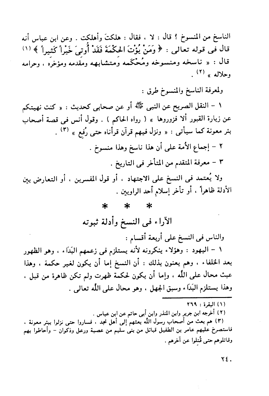 ولا يعتمد في النسخ على الاجتهاد، أو قول المفسرين، أو التعارض بين الأدلة ظاهرًا، أو تأخر إسلام أحد الراويين.