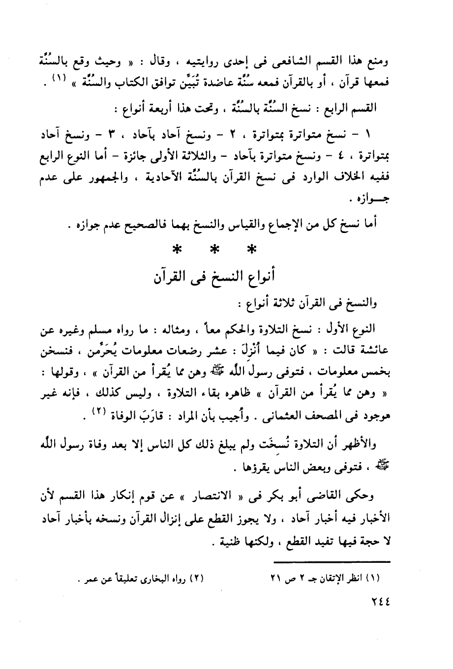 النوع الأول: نسخ التلاوة والحكم معًا، ومثاله: ما رواه مسلم وغيره عن عائشة قالت: "كان فيما أُنزل: عشر رضعات معلومات يُحرِّمن، فنسخن بخمس معلومات، فتوفي رسول الله -صلى الله عليه وسلم- وهن مما يُقرأ من القرآن", وقولها: "وهن مما يُقرأ من القرآن" ظاهره بقاء التلاوة، وليس كذلك، فإنه غير موجود في المصحف العثماني. وأجيب بأن المراد: قارَبَ الوفاة1.