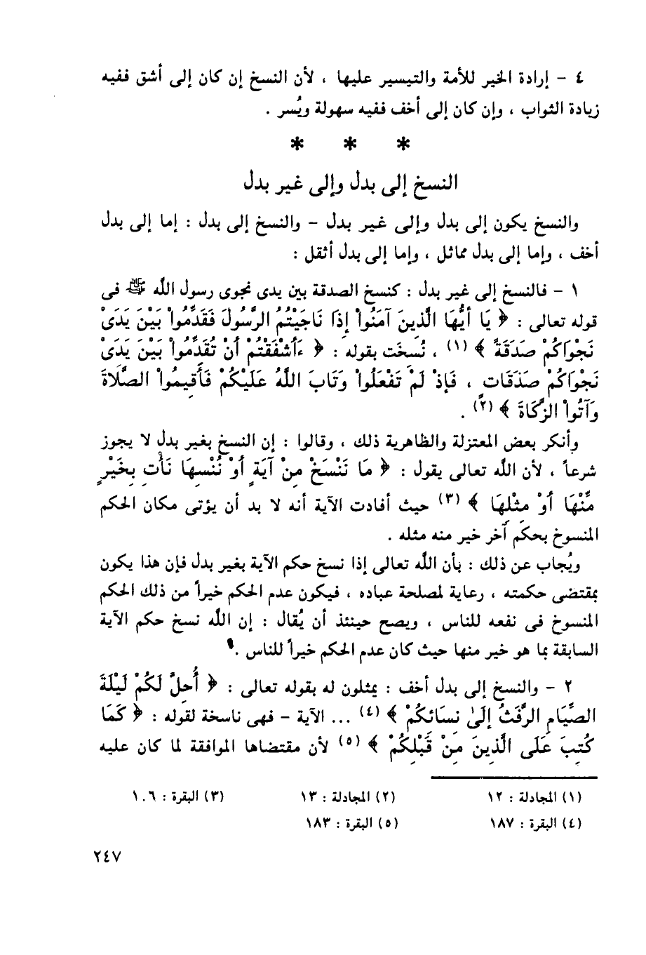 1- فالنسخ إلى غير بدل: كنسخ الصدقة بين يدي نجوى رسول الله -صلى الله عليه وسلم- في قوله تعالى: {يَا أَيُّهَا الَّذِينَ آمَنُوا إِذَا نَاجَيْتُمُ الرَّسُولَ فَقَدِّمُوا بَيْنَ يَدَيْ نَجْوَاكُمْ صَدَقَةً} 1، نُسِخَت بقوله: {أَأَشْفَقْتُمْ أَنْ تُقَدِّمُوا بَيْنَ يَدَيْ نَجْوَاكُمْ صَدَقَاتٍ فَإِذْ لَمْ تَفْعَلُوا وَتَابَ اللَّهُ عَلَيْكُمْ فَأَقِيمُوا الصَّلاةَ وَآتُوا الزَّكَاةَ} 2.