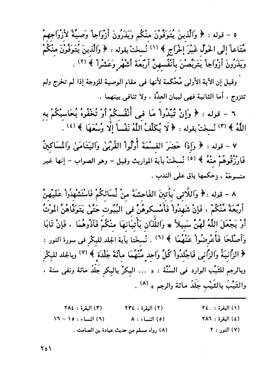 7- قوله: {وَإِذَا حَضَرَ الْقِسْمَةَ أُوْلُوا الْقُرْبَى وَالْيَتَامَى وَالْمَسَاكِينُ فَارْزُقُوهُمْ مِنْهُ} 5, نُسِخت بآية المواريث وقيل -وهو الصواب- إنها غير منسوخة وحكمها باق على الندب.