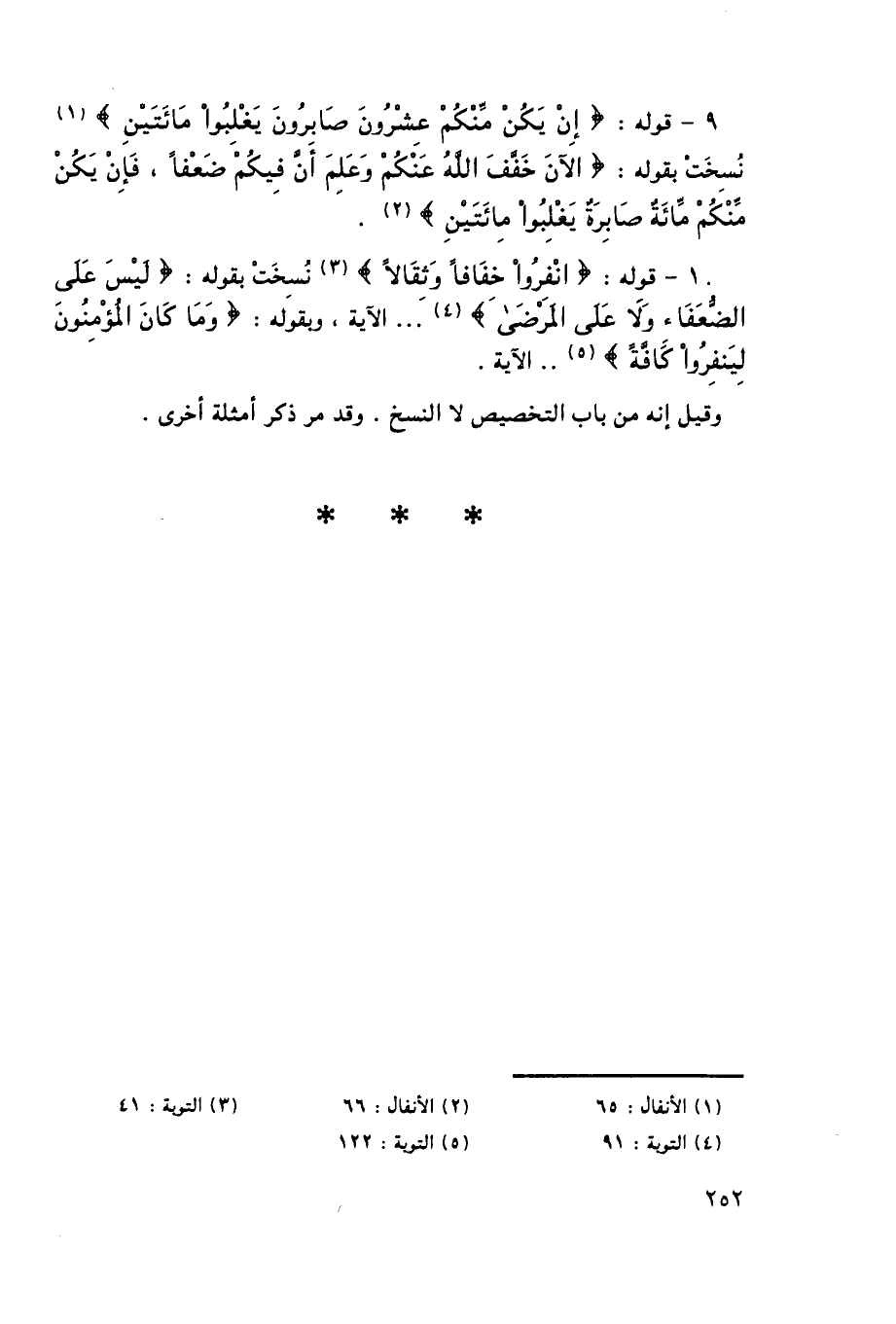 9- قوله: {إِنْ يَكُنْ مِنْكُمْ عِشْرُونَ صَابِرُونَ يَغْلِبُوا مِائَتَيْنِ} 1, نُسِخت بقوله: {الْآنَ خَفَّفَ اللَّهُ عَنْكُمْ وَعَلِمَ أَنَّ فِيكُمْ ضَعْفاً فَإِنْ يَكُنْ مِنْكُمْ مِائَةٌ صَابِرَةٌ يَغْلِبُوا مِائَتَيْنِ} 2.