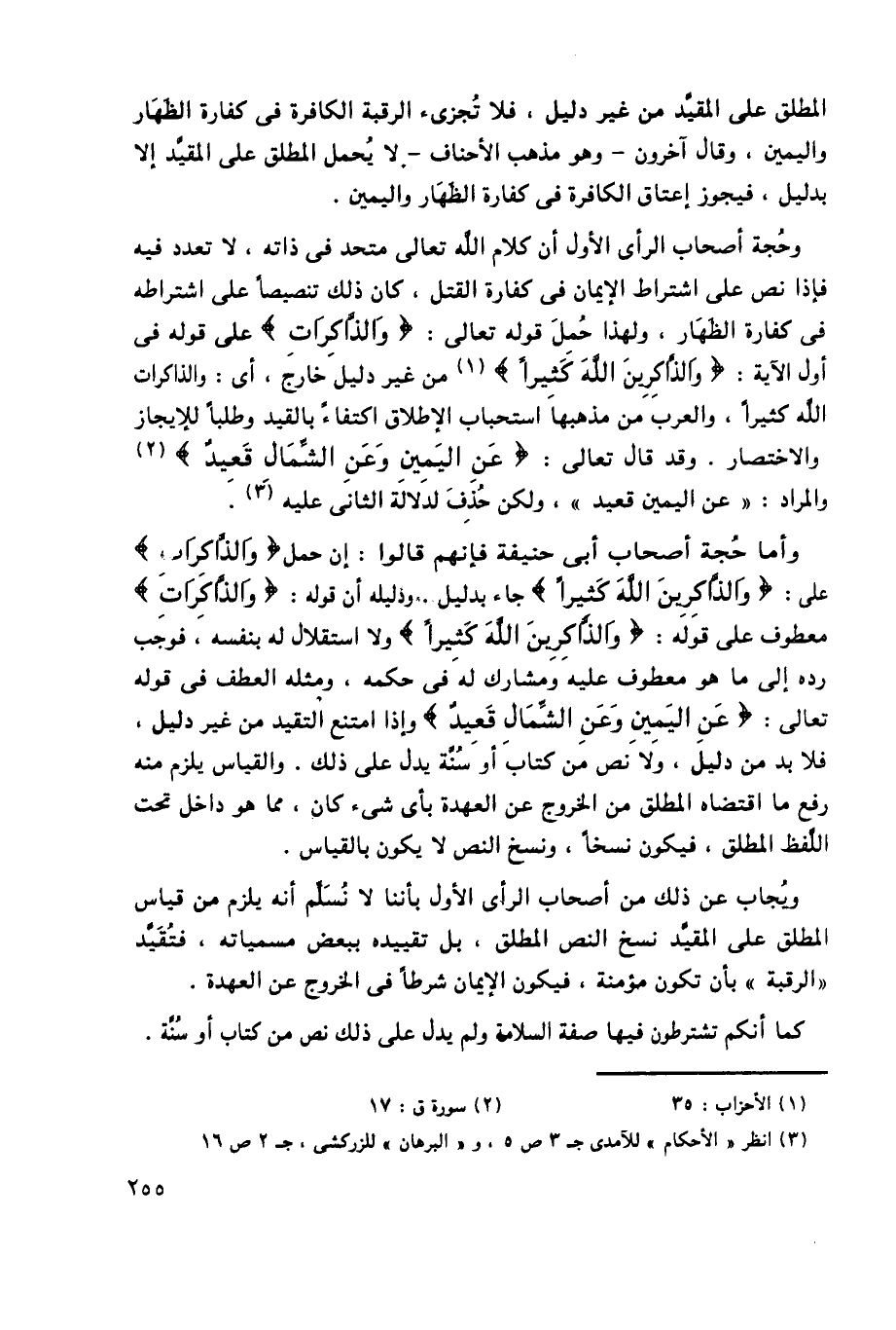 وحُجة أصحاب الرأي الأول أن كلام الله تعالى متحد في ذاته، لا تعدد فيه فإذا نص على اشتراط الإيمان في كفارة القتل، كان ذلك تنصيصًا على اشتراطه في كفارة الظِّهار، ولهذا حُمِل قوله تعالى: {وَالذَّاكِرَاتِ} على قوله في أول الآية: {وَالذَّاكِرِينَ اللَّهَ كَثِيراً} 1, من غير دليل خارج، أي: والذاكرات الله كثيرًا، والعرب من مذهبها استحباب الإطلاق اكتفاء بالقيد وطلبًا للإيجاز والاختصار. وقد قال تعالى: {عَنِ الْيَمِينِ وَعَنِ الشِّمَالِ قَعِيدٌ} 2, والمراد: "عن اليمين قعيد"، ولكن حُذِف لدلالة الثاني عليه3.