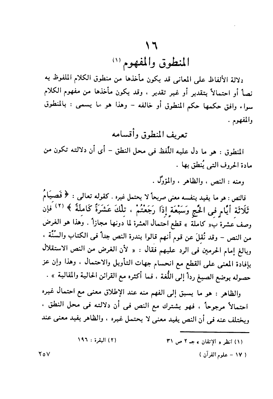 فالنص: هو ما يفيد بنفسه معنى صريحًا لا يحتمل غيره. كقوله تعالى: {فَصِيَامُ ثَلاثَةِ أَيَّامٍ فِي الْحَجِّ وَسَبْعَةٍ إِذَا رَجَعْتُمْ تِلْكَ عَشَرَةٌ كَامِلَةٌ} 1, فإن وصف عشرة ب "كاملة" قطع احتمال العشرة لما دونها مجازًا، وهذا هو الغرض من النص - وقد نُقِل عن قوم أنهم قالوا بندرة النص جدًّا في الكتاب والسٌّنَّة، وبالغ إمام الحرمين في الرد عليهم فقال: "لأن الغرض من النص الاستقلال بإفادة المعنى على القطع مع انحسام جهات التأويل والاحتمال، وهذا وإن عز حصوله بوضع الصيغ ردًّا إلى اللغة، فما أكثره مع القرائن الحالية والمقالية".