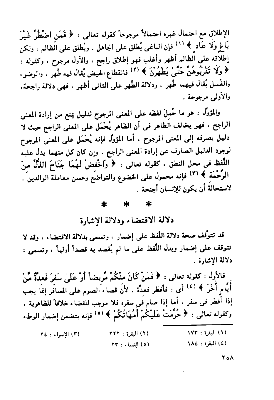 فالأول: كقوله تعالى: {فَمَنْ كَانَ مِنْكُمْ مَرِيضاً أَوْ عَلَى سَفَرٍ فَعِدَّةٌ مِنْ أَيَّامٍ أُخَرَ} 1, أي: فأفطر فعدة؛ لأن قضاء الصوم على المسافر إنما يجب إذا أفطر في سفر، أما إذا صام في سفره فلا موجب للقضاء خلافًا للظاهرية، وكقوله تعالى: {حُرِّمَتْ عَلَيْكُمْ أُمَّهَاتُكُم} 2, فإنه يتضمن إضمار الوطء