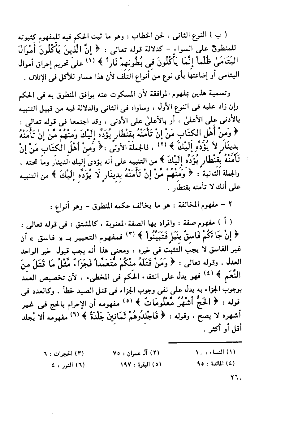 وتسمية هذين بمفهوم الموافقة؛ لأن المسكوت عنه يوافق المنطوق به في الحكم وإن زاد عليه في النوع الأول, وساواه في الثاني والدلالة فيه من قبيل التنبيه بالأدنى على الأعلى، أو بالأعلى على الأدنى، وقد اجتمعا في قوله تعالى: {وَمِنْ أَهْلِ الْكِتَابِ مَنْ إِنْ تَأْمَنْهُ بِقِنْطَارٍ يُؤَدِّهِ إِلَيْكَ وَمِنْهُمْ مَنْ إِنْ تَأْمَنْهُ بِدِينَارٍ لا يُؤَدِّهِ إِلَيْكَ} 2، فالجملة الأولى: {وَمِنْ أَهْلِ الْكِتَابِ مَنْ إِنْ تَأْمَنْهُ بِقِنْطَارٍ يُؤَدِّهِ إِلَيْكَ} من التنبيه على أنه يؤدي إليك الدينار وما تحته، والجملة الثانية: {وَمِنْهُمْ مَنْ إِنْ تَأْمَنْهُ بِدِينَارٍ لا يُؤَدِّهِ إِلَيْكَ} من التنبيه على أنك لا تأمنه بقنطار.