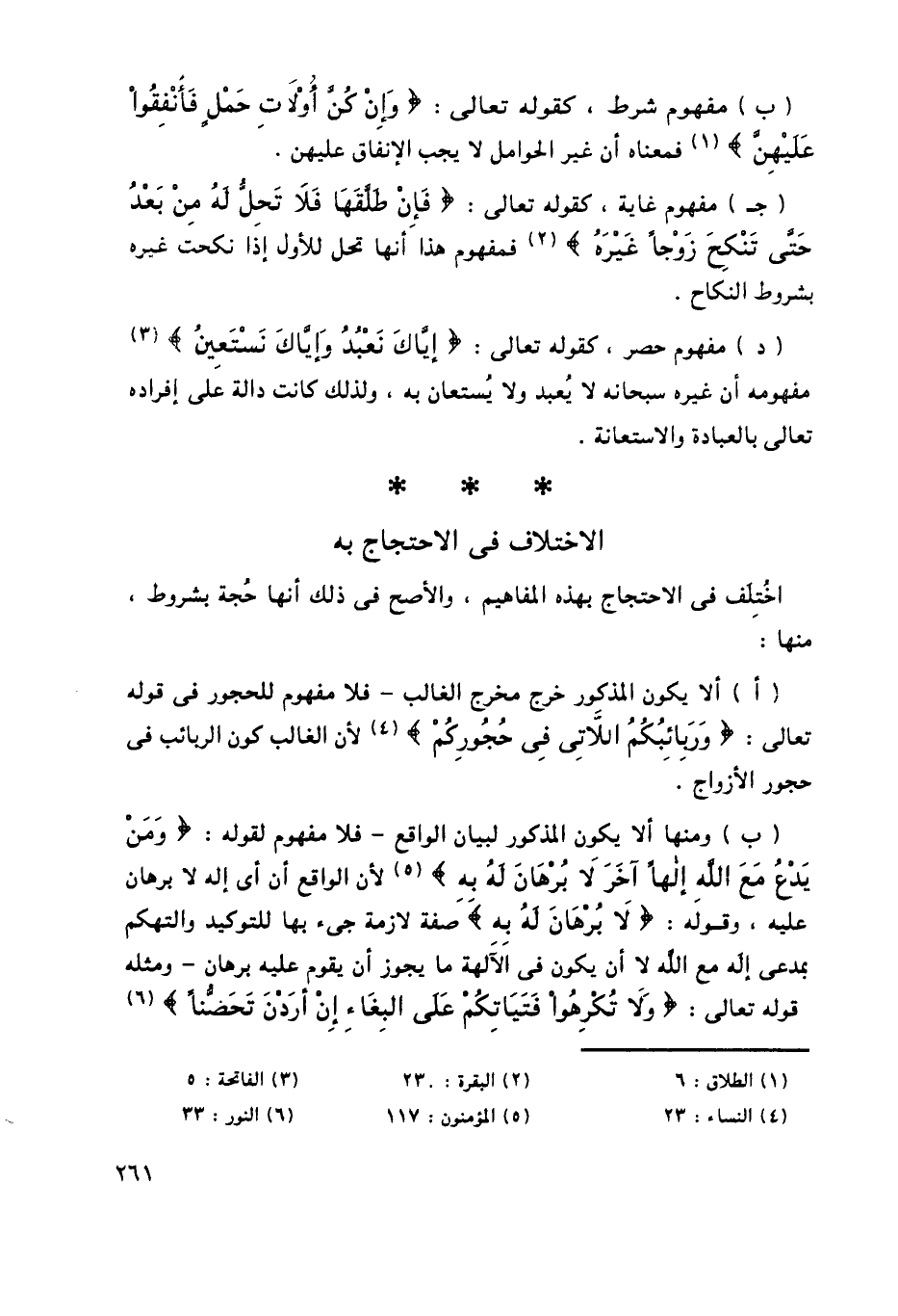 ب- ومنها ألا يكون المذكور لبيان الواقع - فلا مفهوم لقوله: {وَمَنْ يَدْعُ مَعَ اللَّهِ إِلَهاً آخَرَ لا بُرْهَانَ لَهُ بِهِ} 2؛ لأن الواقع أن أي إله لا برهان عليه، وقوله: {لا بُرْهَانَ لَهُ بِه} صفة لازمة جيء بها للتوكيد والتهكم بمدعي إلهٍ مع الله لا أن يكون في الآلهة ما يجوز أن يقوم عليه برهان - ومثله قوله تعالى: {وَلا تُكْرِهُوا فَتَيَاتِكُمْ عَلَى الْبِغَاءِ إِنْ أَرَدْنَ تَحَصُّناً} 3,