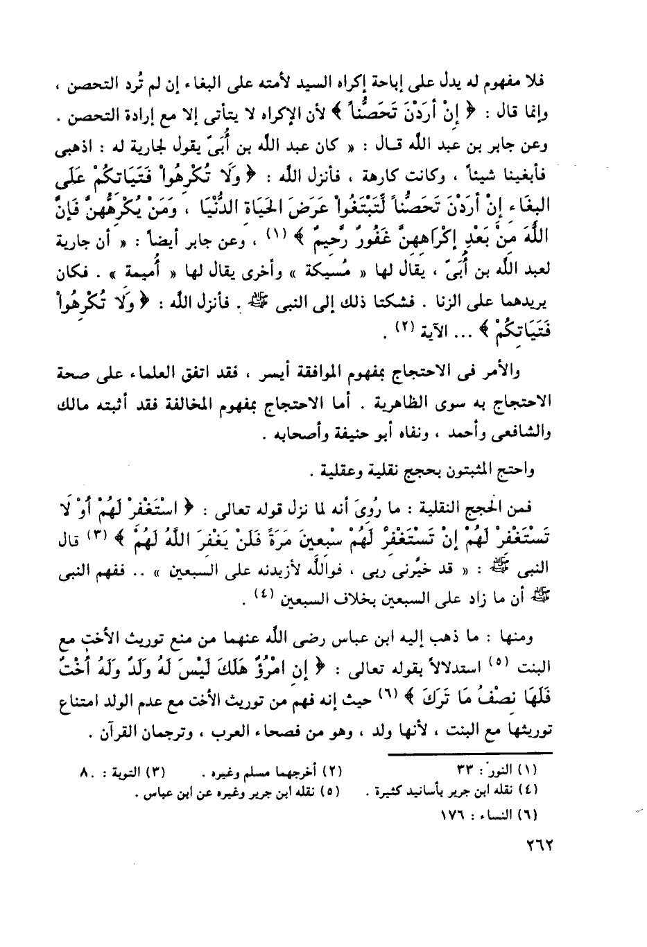 فلا مفهوم له يدل على إباحة إكراه السيد لأمته على البغاء إن لم تُرد التحصن، وإنما قال: {إِنْ أَرَدْنَ تَحَصُّناً} ؛ لأن الإكراه لا يتأتى إلا مع إرادة التحصن. وعن جابر بن عبد الله قال: "كان عبد الله بن أُبَيٍّ يقول لجارية له: اذهبي فأبغينا شيئًا، وكانت كارهة، فأنزل الله: {وَلا تُكْرِهُوا فَتَيَاتِكُمْ عَلَى الْبِغَاءِ إِنْ أَرَدْنَ تَحَصُّناً لِتَبْتَغُوا عَرَضَ الْحَيَاةِ الدُّنْيَا وَمَنْ يُكْرِهْهُنَّ فَإِنَّ اللَّهَ مِنْ بَعْدِ إِكْرَاهِهِنَّ غَفُورٌ رَحِيمٌ} 1، وعن جابر أيضًا: "أن جارية لعبد الله بن أُبَيٍّ، يقال لها "مُسيكة" وأخرى يقال لها "أميمة". فكان يريدهما على الزنا. فشكتا ذلك إلى النبي -صلى الله عليه وسلم- فأنزل الله: {وَلا تُكْرِهُوا فَتَيَاتِكُمْ} ... الآية2.