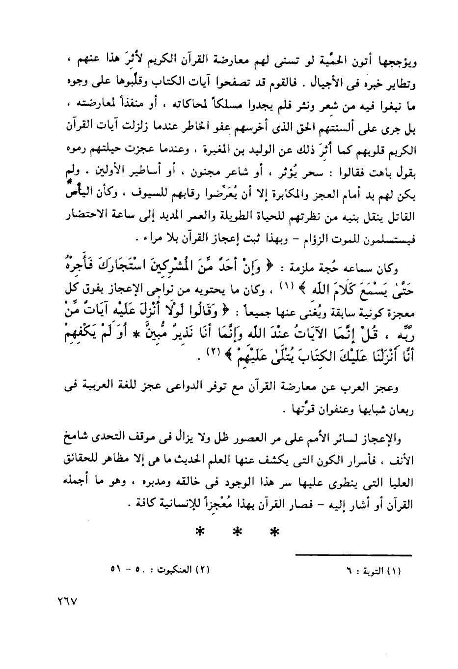 وكان سماعه حجة ملزمة: {وَإِنْ أَحَدٌ مِنَ الْمُشْرِكِينَ اسْتَجَارَكَ فَأَجِرْهُ حَتَّى يَسْمَعَ كَلامَ اللَّهِ} 1، وكان ما يحتويه من نواحي الإعجاز يفوق كل معجزة كونية سابقة ويُغني عنها جميعًا: {وَقَالُوا لَوْلا أُنْزِلَ عَلَيْهِ آيَاتٌ مِنْ رَبِّهِ قُلْ إِنَّمَا الآيَاتُ عِنْدَ اللَّهِ وَإِنَّمَا أَنَا نَذِيرٌ مُبِينٌ أَوَلَمْ يَكْفِهِمْ أَنَّا أَنْزَلْنَا عَلَيْكَ الْكِتَابَ يُتْلَى عَلَيْهِمْ} 2.