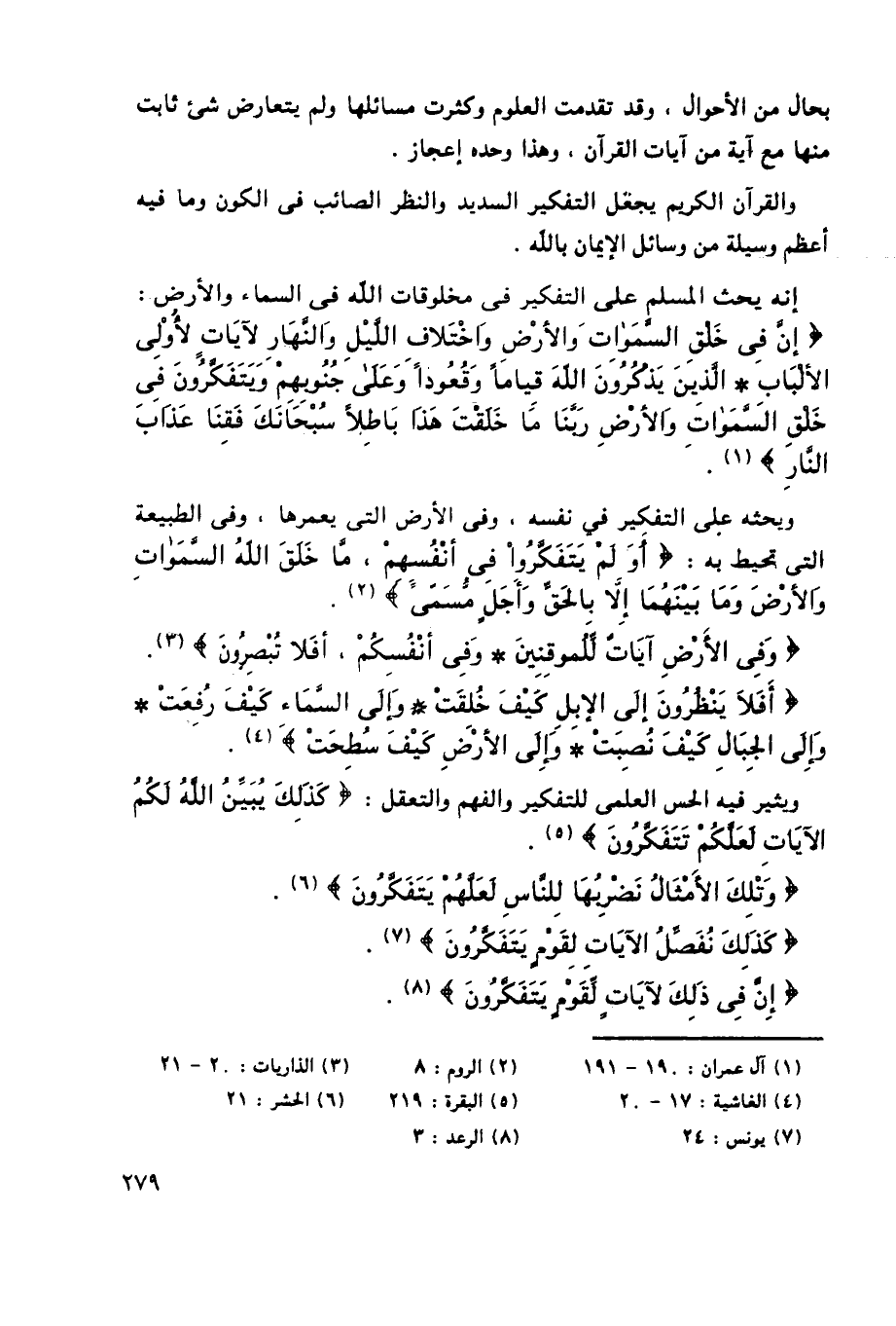 إنه يحث المسلم على التفكير في مخلوقات الله في السماء والأرض: {إِنَّ فِي خَلْقِ السَّمَاوَاتِ وَالأَرْضِ وَاخْتِلافِ اللَّيْلِ وَالنَّهَارِ لآيَاتٍ لأُولِي الأَلْبَابِ، الَّذِينَ يَذْكُرُونَ اللَّهَ قِيَامًا وَقُعُودًا وَعَلَى جُنُوبِهِمْ وَيَتَفَكَّرُونَ فِي خَلْقِ السَّمَاوَاتِ وَالأَرْضِ رَبَّنَا مَا خَلَقْتَ هَذَا بَاطِلًا سُبْحَانَكَ فَقِنَا عَذَابَ النَّارِ} 1.