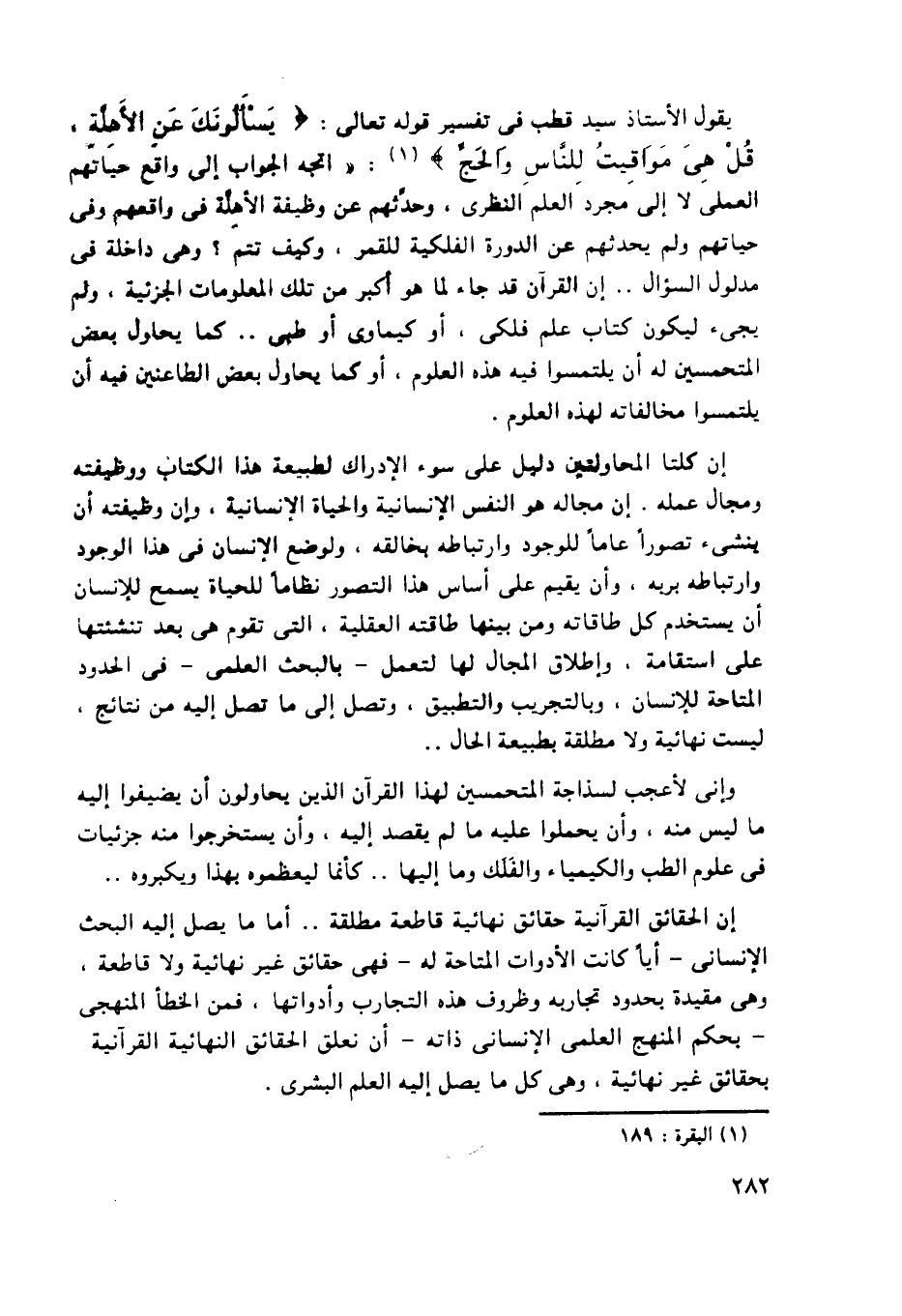 يقول الأستاذ سيد قطب في تفسير قوله تعالى: {يَسْأَلونَكَ عَنِ الْأَهِلَّةِ قُلْ هِيَ مَوَاقِيتُ لِلنَّاسِ وَالْحَجِّ} 1: "اتجه الجواب إلى واقع حياتهم العملي لا إلى مجرد العلم النظري، وحدثهم عن وظيفة الأهلة في واقعهم وفي حياتهم ولم يحدثهم عن الدورة الفلكية للقمر، وكيف تتم؟ وهي داخلة في مدلول السؤال.. إن القرآن قد جاء لما هو أكبر من تلك المعلومات الجزئية، ولم يجئ ليكون كتاب علم فلكي، أو كيماوي أو طبي.. كما يحاول بعض المتحمسين له أن يلتمسوا فيه هذه العلوم، أو كما يحاول بعض الطاعنين فيه أن يلتمسوا مخالفاته لهذه العلوم.