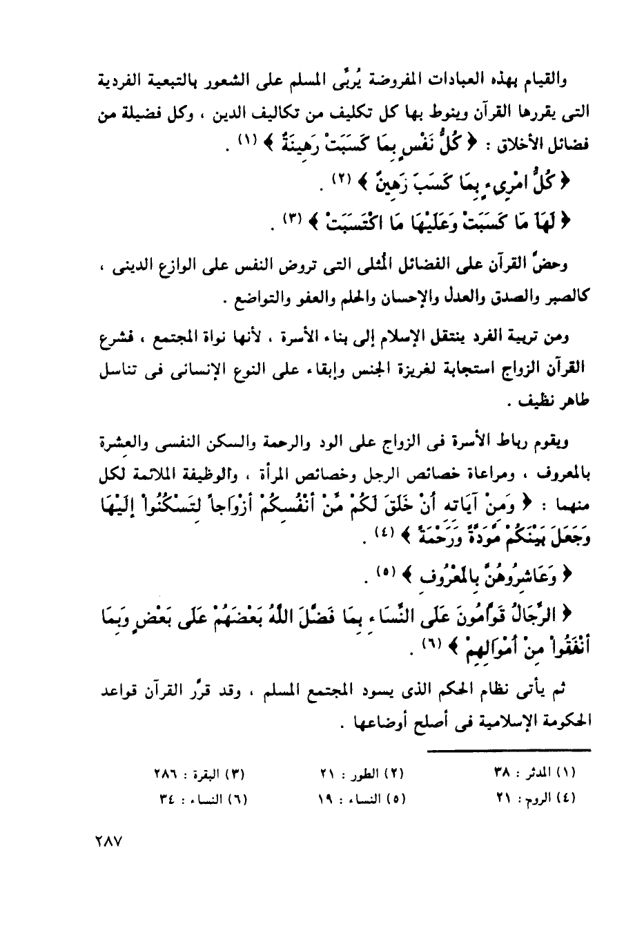 والقيام بهذه العبادات المفروضة يربي المسلم على الشعور بالتبعية الفردية التي يقررها القرآن وينوط بها كل تكليف من تكاليف الدين، وكل فضيلة من فضائل الأخلاق: {كُلُّ نَفْسٍ بِمَا كَسَبَتْ رَهِينَةٌ} 1.