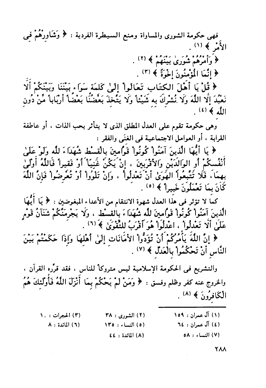 فهي حكومة الشورى والمساواة ومنع السيطرة الفردية: {وَشَاوِرْهُمْ فِي الْأَمْرِ} 1.