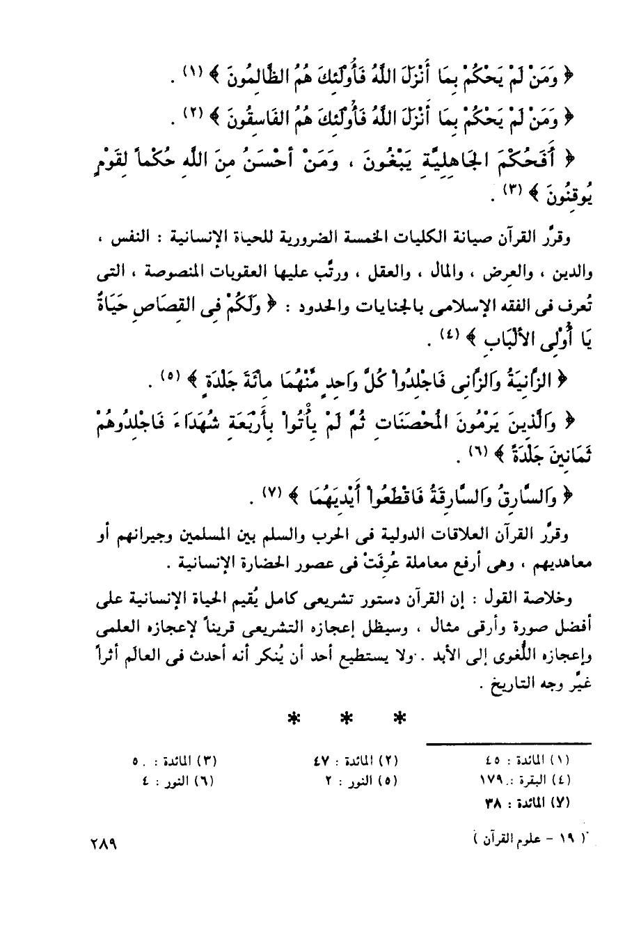 وقرر القرآن صيانة الكليات الخمسة الضرورية للحياة الإنسانية: النفس، والدين، والعِرض، والمال، والعقل, ورتب عليها العقوبات المنصوصة، التي تُعرف في الفقه الإسلامي بالجنايات والحدود: {وَلَكُمْ فِي الْقِصَاصِ حَيَاةٌ يَا أُولِي الْأَلْبَابِ} 4.