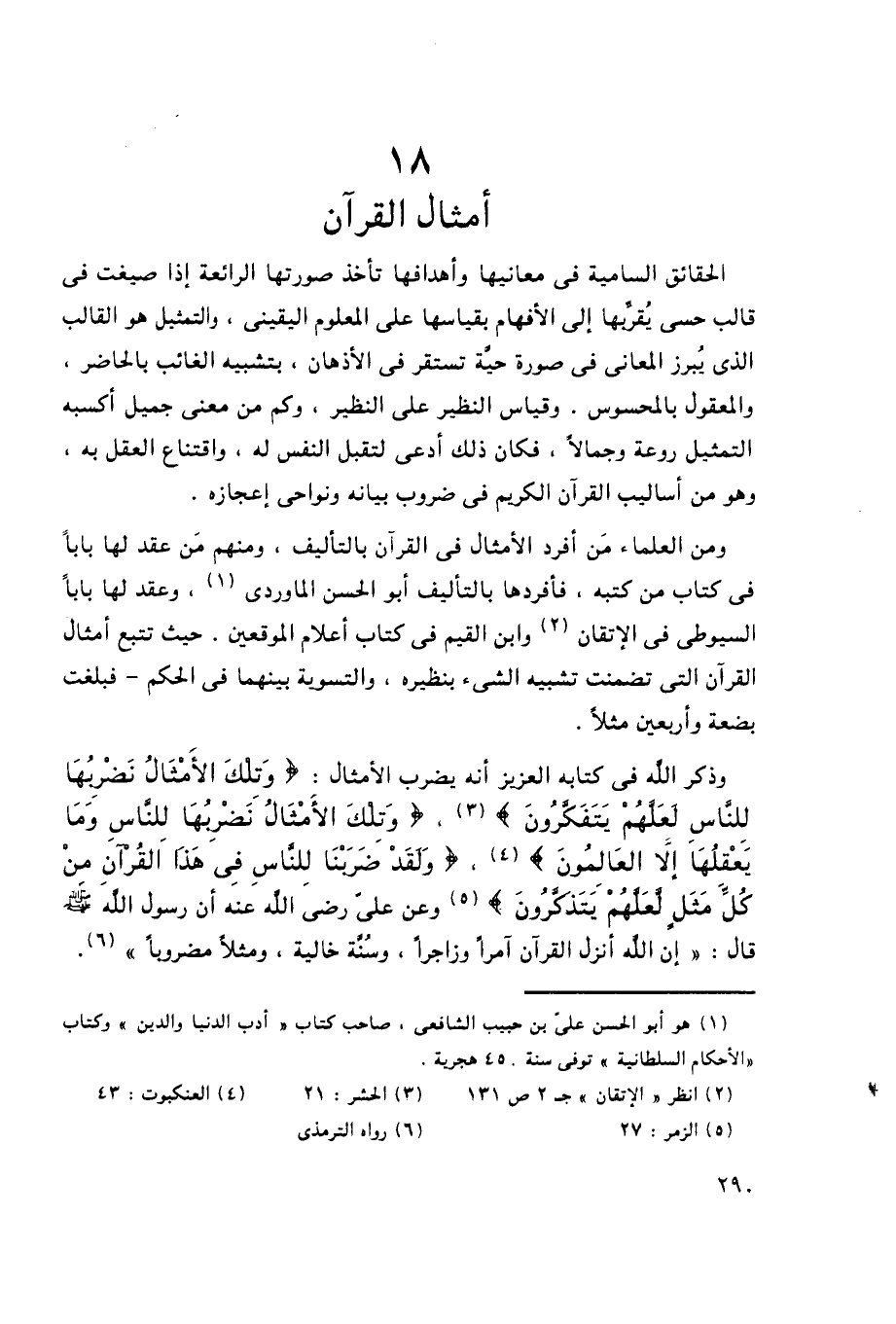 وذكر الله في كتابه العزيز أنه يضرب الأمثال: {وَتِلْكَ الْأَمْثَالُ نَضْرِبُهَا لِلنَّاسِ لَعَلَّهُمْ يَتَفَكَّرُونَ} 3، {وَتِلْكَ الْأَمْثَالُ نَضْرِبُهَا لِلنَّاسِ وَمَا يَعْقِلُهَا إِلَّا الْعَالِمُونَ} 4، {وَلَقَدْ ضَرَبْنَا لِلنَّاسِ فِي هَذَا الْقُرْآنِ مِنْ كُلِّ مَثَلٍ لَعَلَّهُمْ يَتَذَكَّرُونَ} 5, وعن علي رضي الله عنه أن رسول الله -صلى الله عليه وسلم- قال: "إن الله أنزل القرآن آمرًا وزاجرًا، وسُنة خالية، ومثلًا مضروبًا" 6.