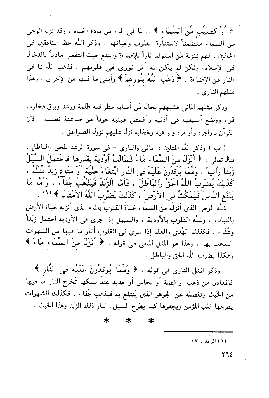 ب- وذكر الله المثلين: المائي والناري - في سورة الرعد للحق والباطل. فقال تعالى: {أَنْزَلَ مِنَ السَّمَاءِ مَاءً فَسَالَتْ أَوْدِيَةٌ بِقَدَرِهَا فَاحْتَمَلَ السَّيْلُ زَبَداً رَابِياً وَمِمَّا يُوقِدُونَ عَلَيْهِ فِي النَّارِ ابْتِغَاءَ حِلْيَةٍ أَوْ مَتَاعٍ زَبَدٌ مِثْلُهُ كَذَلِكَ يَضْرِبُ اللَّهُ الْحَقَّ وَالْبَاطِلَ فَأَمَّا الزَّبَدُ فَيَذْهَبُ جُفَاءً وَأَمَّا مَا يَنْفَعُ النَّاسَ فَيَمْكُثُ فِي الْأَرْضِ كَذَلِكَ يَضْرِبُ اللَّهُ الْأَمْثَالَ} 1.