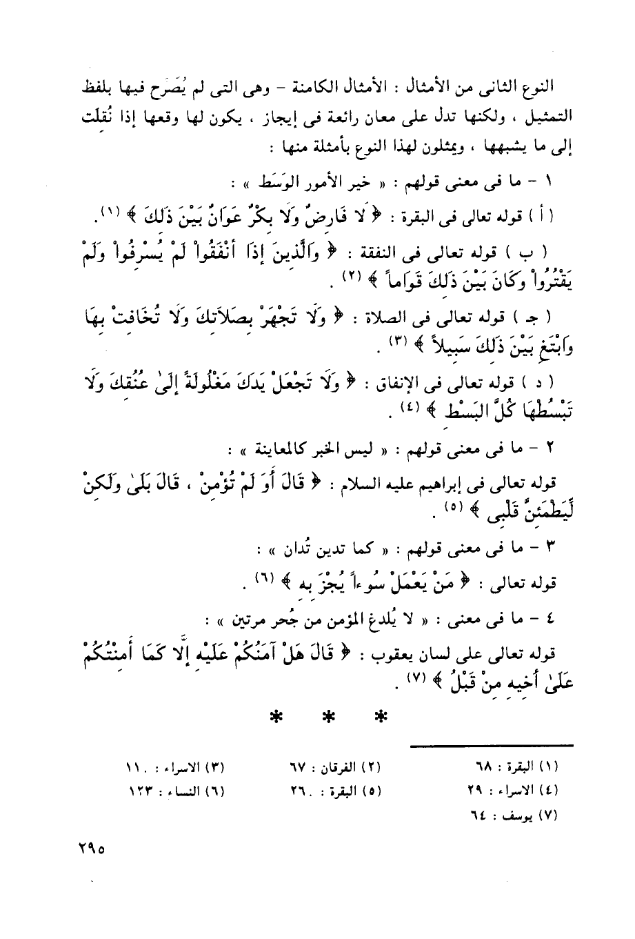 د- قوله تعالى في الإنفاق: {وَلا تَجْعَلْ يَدَكَ مَغْلُولَةً إِلَى عُنُقِكَ وَلا تَبْسُطْهَا كُلَّ الْبَسْطِ} 4.