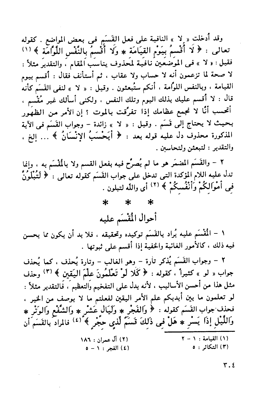 وقد أدخلت "لا" النافية على فعل القسم في بعض المواضع. كقوله تعالى: {لا أُقْسِمُ بِيَوْمِ، الْقِيَامَةِ وَلا أُقْسِمُ بِالنَّفْسِ اللَّوَّامَةِ} 1, فقيل: "لا" في الموضعين نافية لمحذوف يناسب المقام، والتقدير مثلًا: لا صحة لما تزعمون أنه لا حساب ولا عقاب، ثم استأنف فقال: أقسم بيوم القيامة، وبالنفس اللوامة، أنكم ستبعثون. وقيل: "لا" لنفي القسم كأنه قال: لا أقسم عليك بذلك اليوم وتلك النفس، ولكني أسألك غير مقسِم، أتحسب أنَّا لا نجمع عظامك إذا تفرقت بالموت؟ إن الأمر من الظهور بحيث لا يحتاج إلى قسم. وقيل: "لا" زائدة - وجواب القسم في الآية المذكورة محذوف دل عليه قوله بعد: {أَيَحْسَبُ الْإِنْسَانُ} ... إلخ، والتقدير: لتبعثن ولتحاسبن.