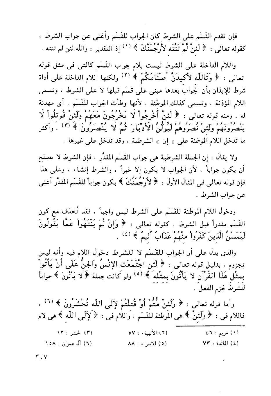 والذي يدل على أن الجواب للقسم لا للشرط دخول اللام فيه وأنه ليس بمجزوم، بدليل قوله تعالى: {قُلْ لَئِنِ اجْتَمَعَتِ الْإِنْسُ وَالْجِنُّ عَلَى أَنْ يَأْتُوا بِمِثْلِ هَذَا الْقُرْآنِ لا يَأْتُونَ بِمِثْلِهِ} 5, ولو كانت جملة {لا يَأْتُونَ} جوابًا للشرط لجزم الفعل.