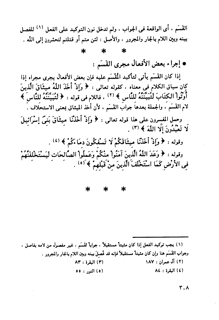 إذا كان القسم يأتي لتأكيد المُقسم عليه فإن بعض الأفعال يجري مجراه إذا كان سياق الكلام في معناه، كقوله تعالى: {وَإِذْ أَخَذَ اللَّهُ مِيثَاقَ الَّذِينَ أُوتُوا الْكِتَابَ لَتُبَيِّنُنَّهُ لِلنَّاسِ} 2، فاللام في قوله: {لَتُبَيِّنُنَّهُ لِلنَّاسِ} لام القسم، والجملة بعدها جواب القسم؛ لأن أخذ الميثاق بمعنى الاستحلاف.