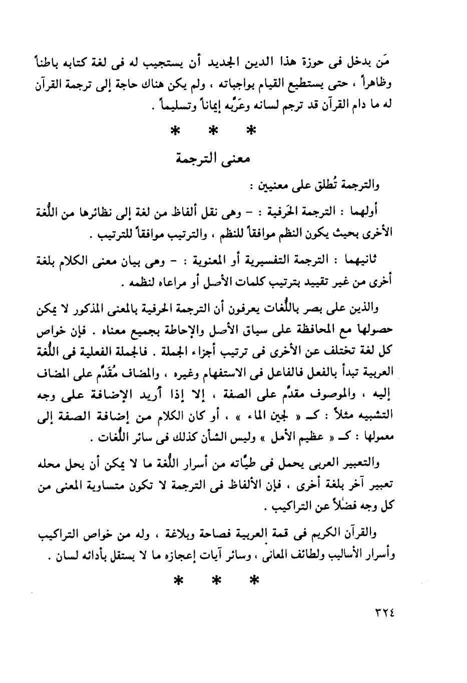 من يدخل في حوزة هذا الدين الجديد أن يستجيب له في لغة كتابه باطنًا وظاهرًا، حتى يستطيع القيام بواجباته، ولم يكن هناك حاجة إلى ترجمة القرآن له ما دام القرآن قد ترجم لسانه وعربه إيمانًا وتسليمًا.