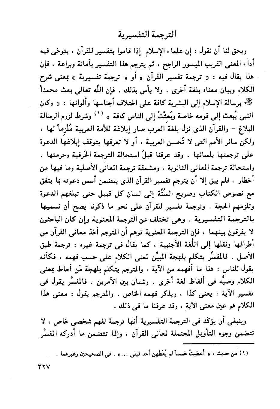 ويحق لنا أن نقول: إن علماء الإسلام إذا قاموا بتفسير للقرآن، يتوخى فيه أداء المعنى القريب الميسور الراجح، ثم يترجم هذا التفسير بأمانة وبراعة، فإن هذا يقال فيه: "ترجمة تفسير القرآن" أو "ترجمة تفسيرية" بمعنى شرح الكلام وبيان معناه بلغة أخرى. ولا بأس بذلك. فإن الله تعالى بعث محمدًا -صلى الله عليه وسلم- برسالة الإسلام إلى البشرية كافة على اختلاف أجناسها وألوانها: "وكان النبي يُبعث إلى قومه خاصة وبُعثت إلى الناس كافة" 1, وشرط لزوم الرسالة البلاغ - والقرآن الذي نزل بلغة العرب صار إبلاغه للأمة العربية ملزمًا لها، ولكن سائر الأمم التي لا تُحسن العربية، أو لا تعرفها يتوقف إبلاغها الدعوة على ترجمتها بلسانها. وقد عرفنا قبل استحالة الترجمة الحرفية وحرمتها. واستحالة ترجمة المعاني الثانوية، ومشقة ترجمة المعاني الأصلية وما فيها من أخطار، فلم يبق إلا أن يترجم تفسير القرآن الذي يتضمن أسس دعوته بما يتفق مع نصوص الكتاب وصريح السٌّنَّة إلى لسان كل قبيل حتى تبلغهم الدعوة وتلزمهم الحجة. وترجمة تفسير للقرآن على نحو ما ذكرنا يصح أن نسميها بالترجمة التفسيرية. وهي تختلف عن الترجمة المعنوية وإن كان الباحثون لا يفرقون بينهما، فإن الترجمة المعنوية توهم أن المترجم أخذ معاني القرآن من أطرافها ونقلها إلى اللغة الأجنبية، كما يقال في ترجمة غيره: ترجمة طبق الأصل. فالمفسِّر يتكلم بلهجة المبيِّن لمعنى الكلام على حسب فهمه، فكأنه يقول للناس: هذا ما أفهمه من الآية، والمترجم يتكلم بلهجة من أحاط بمعنى الكلام وصبَّه في ألفاظ لغة أخرى. وشتان بين الأمرين. فالمفسِّر يقول في تفسير الآية: يعني كذا، ويذكر فهمه الخاص. والمترجم يقول: معنى هذا الكلام هو عين معنى الآية، وقد عرفنا ما في ذلك.